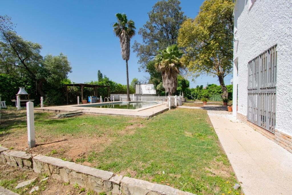 Magnífico chalet independiente en Espartinas, con excelentes calidades, en Urbanización Los Tres Pinos.La propiedad se sitúa en una parcela de 4584m2 y dispone de 380m2 construidos distribuidos en dos plantas.Accedemos a la vivienda por un pequeño porche de estilo rústico.En planta baja tenemos un gran salón con chimenea, muy acogedor y confortable y zona comedor con grandes ventanales desde donde podemos acceder a un bonito porche con vistas al jardín trasero y piscina, donde podrá disfrutar de estupendas reuniones con la familia y amigos..La cocina es independiente, de estilo moderno, y se encuentra amueblada, muy cómoda, con un gran trastero y salida a porche trasero y a una de las zonas más bonitas de la finca, con árboles frutales y caballerizas. También hay un aseo.La vivienda dispone de cinco amplios dormitorios, uno de ellos en la buhardilla, el principal con magnífico vestidor y baño completo de estilo rústico, con placa ducha. En el pasillo tenemos otro baño bastante amplio completo con placa ducha.Las ventanas son de climalit de aluminio lacado en blanco, las puertas de madera y el suelo de tarima y gres, dispone de instalación de aire acondicionado y ventiladores de techo.La finca tiene una zona recreativa de barbacoa y piscina y una gran pista de baloncesto.Tiene otra zona de frutales llena de naranjos dulces y caballerizas con cuatro boxer, con la posibilidad de darle otros usos.Zona de aparcamiento cubierto para cuatro vehículos.La ubicación de la finca es perfecta por el rápido acceso a Espartinas, Villanueva del Ariscal, Umbrete etc... y sobre todo a 10 minutos de Sevilla.No se lo piense más y visítela con nosotros, le va a encantar.Informamos a nuestros clientes compradores que el precio de venta no incluye lo siguiente: Honorarios de la agencia inmobiliaria, Impuestos (I.T.P., I.V.A. o A.J.D., en su caso) ni otros gastos de la compraventa (gastos de Registro de la Propiedad, Notaría, Gestoría ni de posible Financiación). Documento D.I.A. a disposición del consumidor según Decreto 218/2005 Junta de Andalucía.