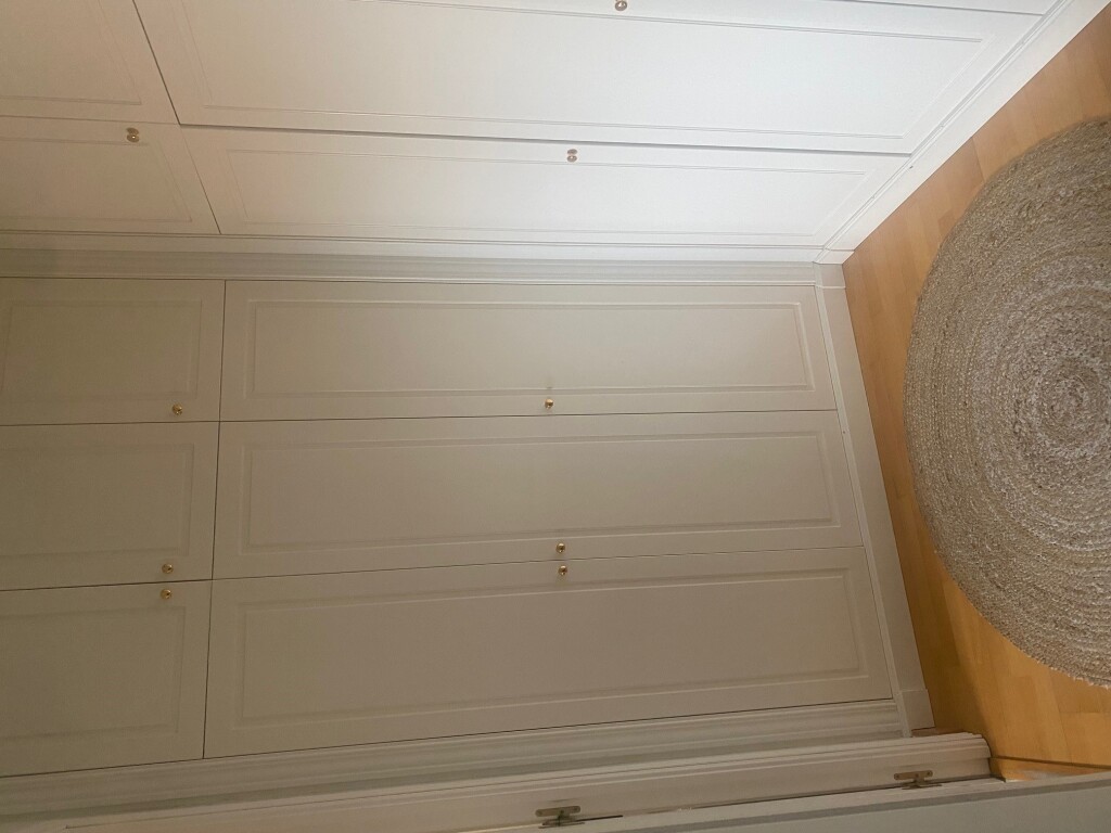 Recibidor con armario de tres portes i altillos hechos a mida por carpintero y lacados en blanco Baño completo con ducha.