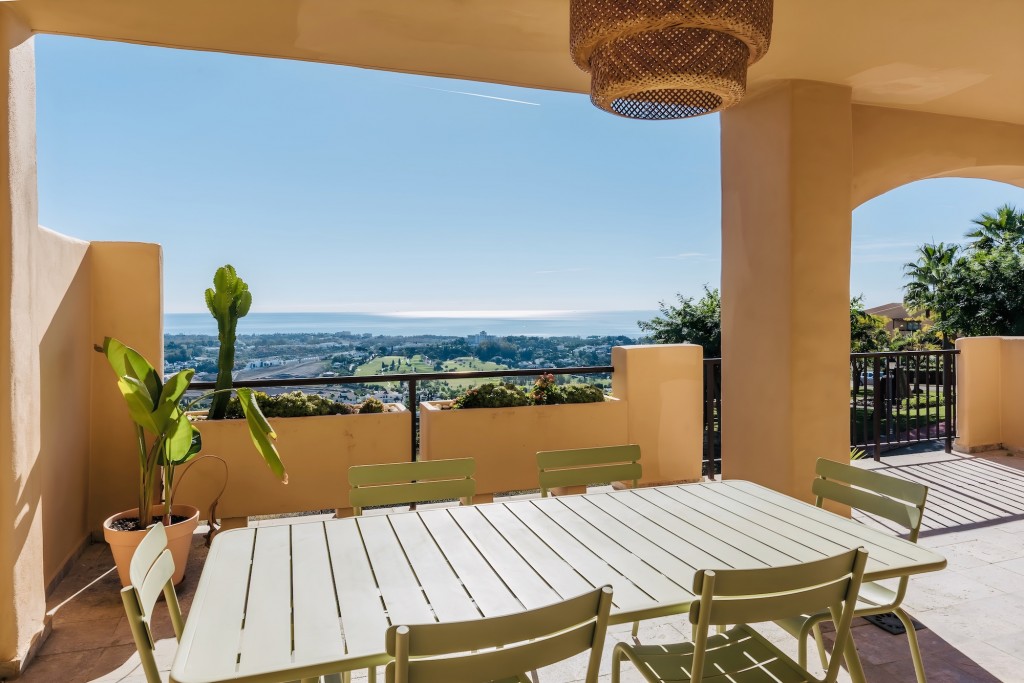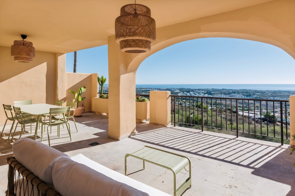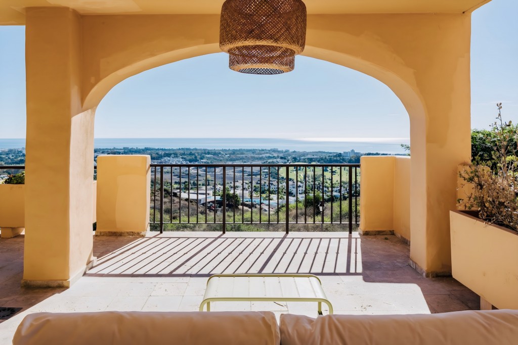 En el exterior, una amplia terraza de 44m² orientada al Sur, parcialmente cubierta (para disfrutarla en todas las estaciones), ofrece vistas panorámicas al mar Mediterráneo, Marbella, los campos de golf y, en los días despejados, hasta la costa africana. En el interior, estas impresionantes vistas se aprecian desde la entrada, en cada estancia de día e incluso desde la suite principal.