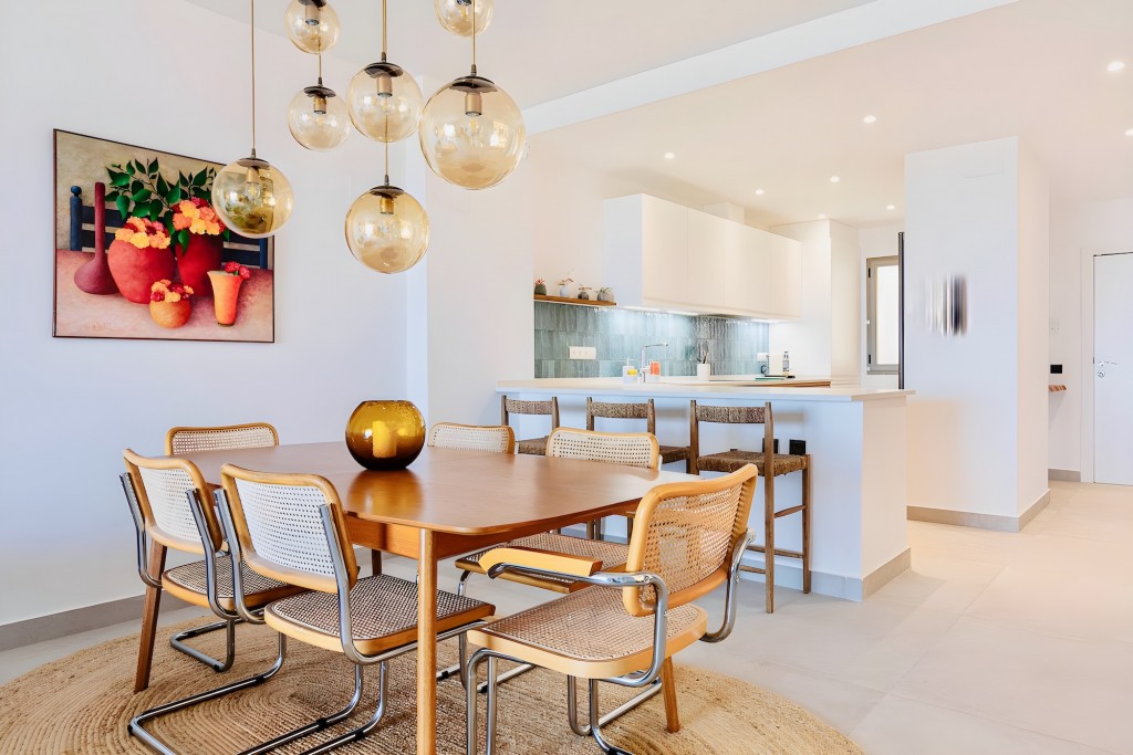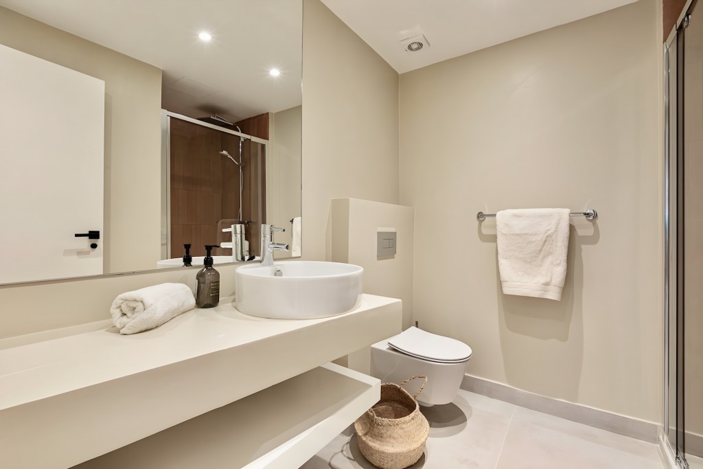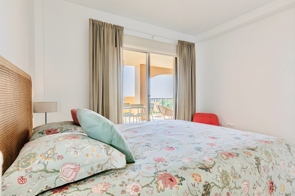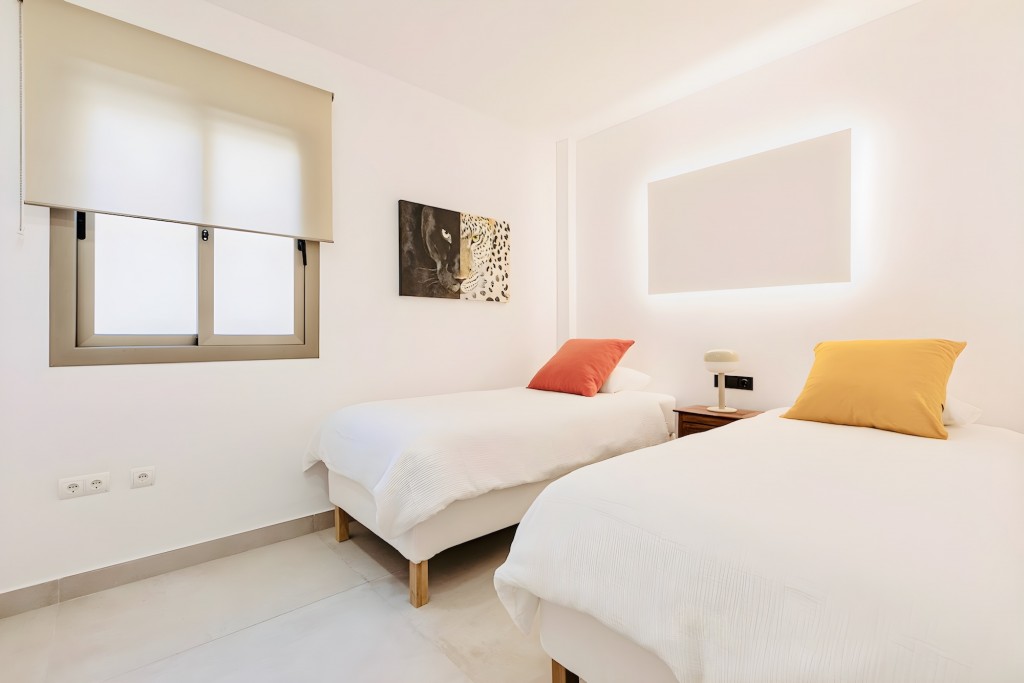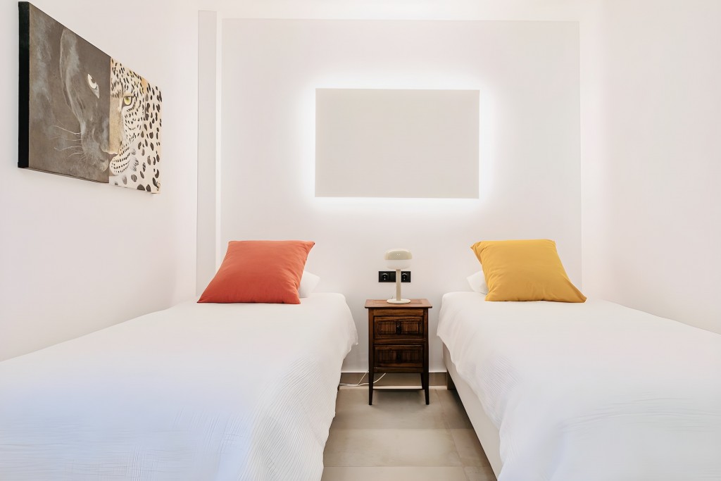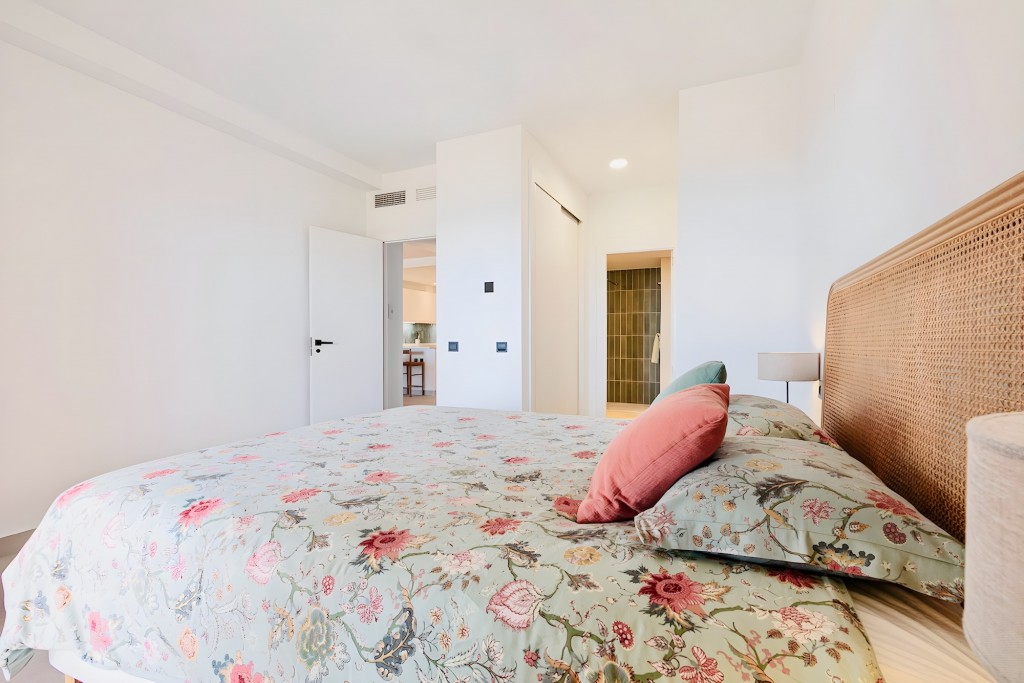 La suite principal, que se abre directamente a la terraza, incluye un vestidor y un baño moderno de microcemento. La segunda habitación, ideal para invitados o niños, cuenta con armarios empotrados y un baño también de microcemento.