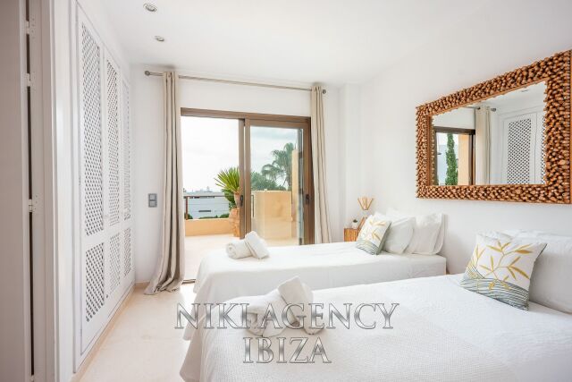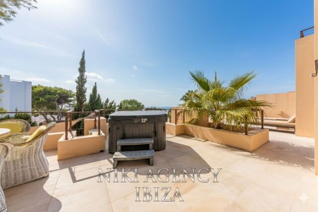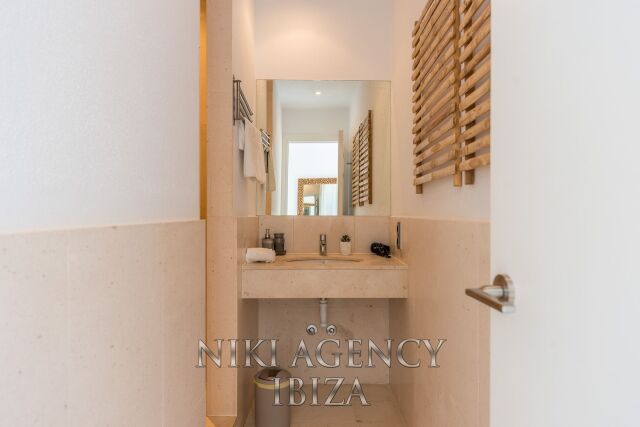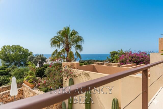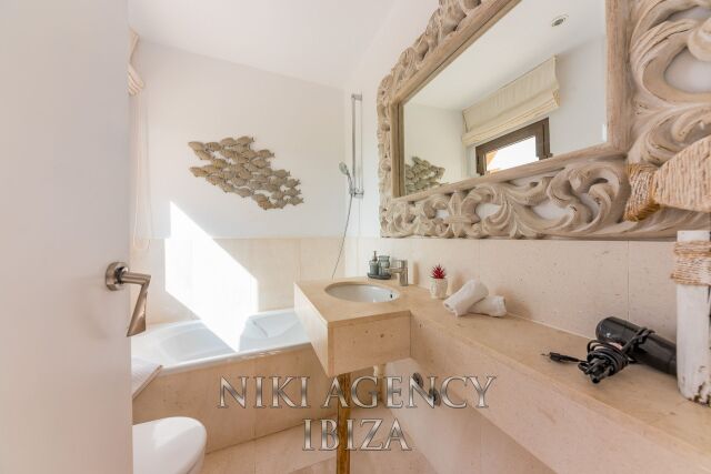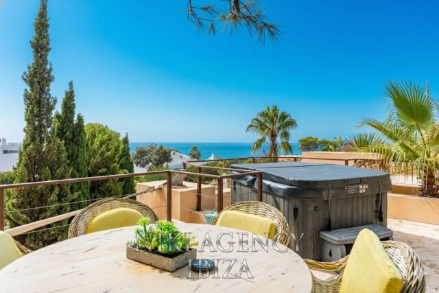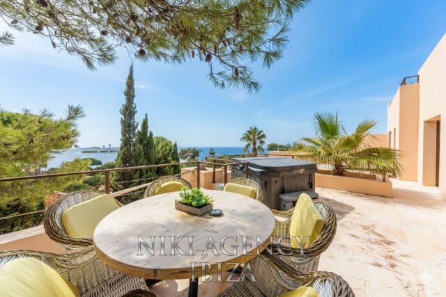 Esta elegante villa, situada en la codiciada urbanización Caló d’en Real, combina diseño moderno, encanto mediterráneo y una ubicación privilegiada con impresionantes vistas al mar.
