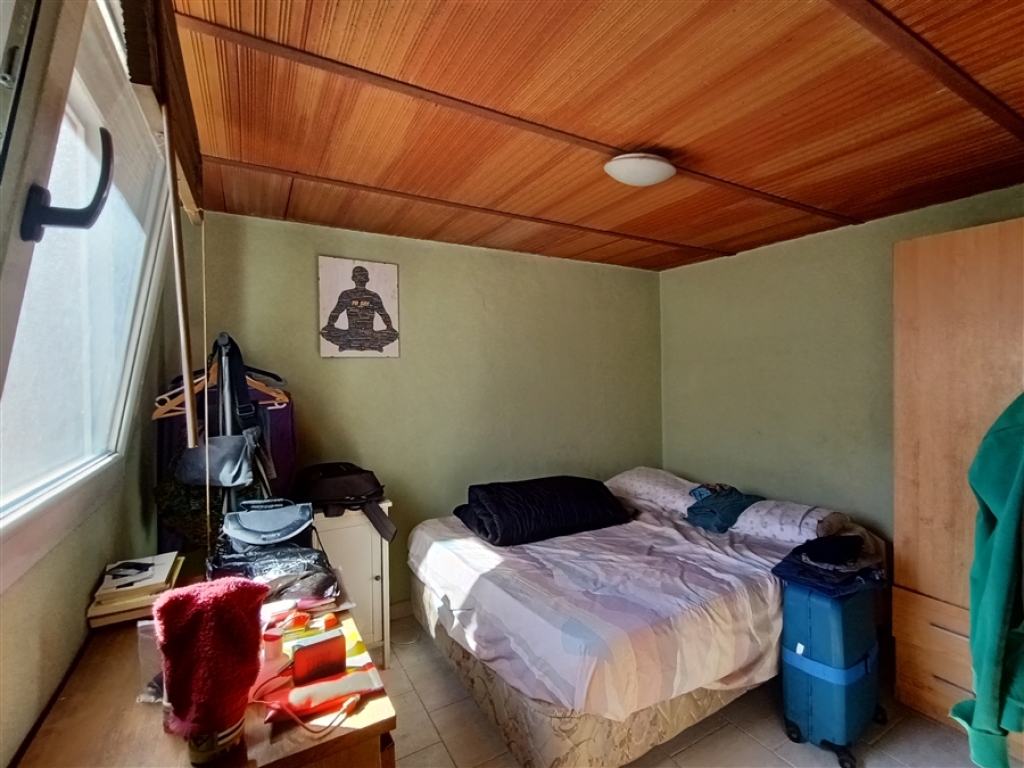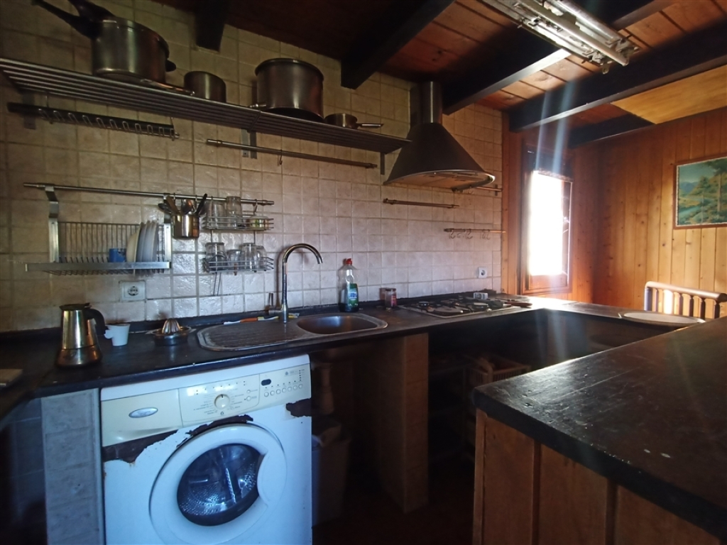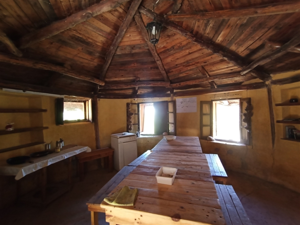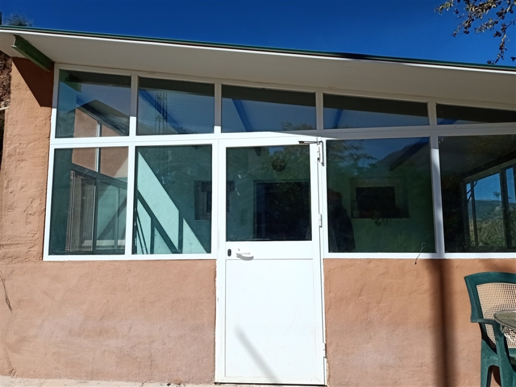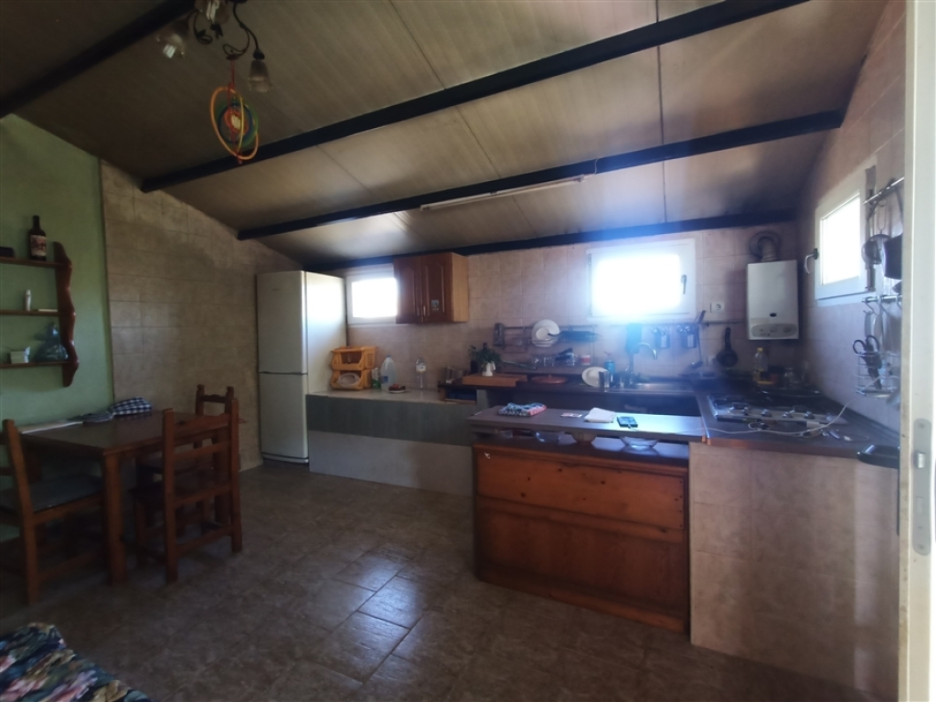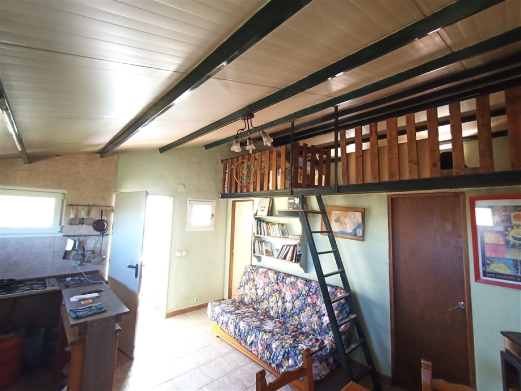 La casa principal, de 163 m², está distribuida en tres niveles. Su porche acristalado permite disfrutar de las vistas panorámicas. La planta baja cuenta con una cocina abierta, salón con estufa de leña, dos dormitorios y un baño seco, con opción de reactivar la fosa biológica. Una acogedora buhardilla, accesible mediante una escalera desplegable, puede funcionar como tercer dormitorio. Desde una elegante escalera de caracol se accede a una bodega subterránea, ideal para mantener el vino y el aceite ecológico de la finca.
