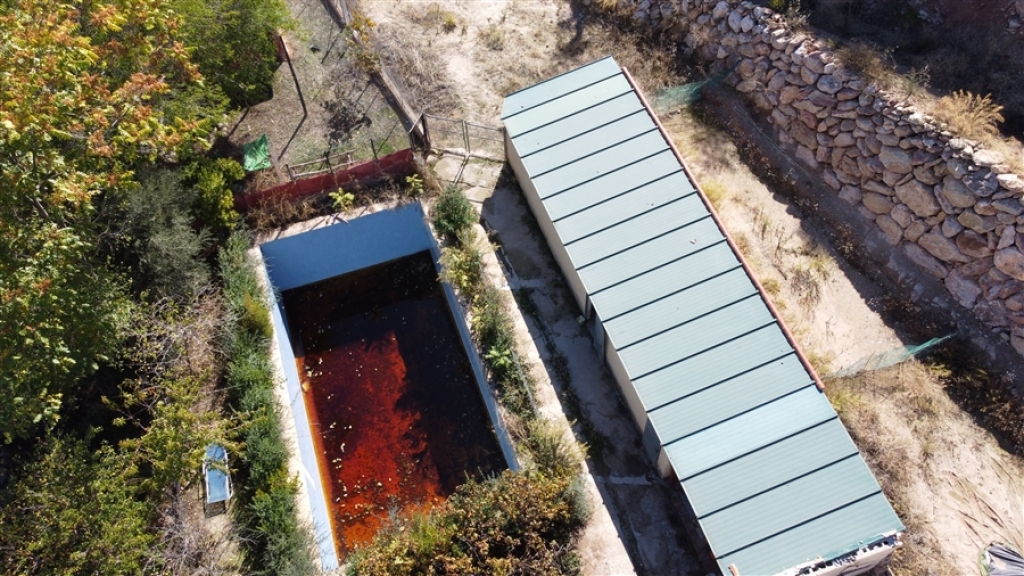 En la parte alta, se encuentra una gran piscina de riego de 70 metros que se utilizó para acuaponía y cría de peces, además de un pozo de manantial que proporciona agua de excelente calidad.