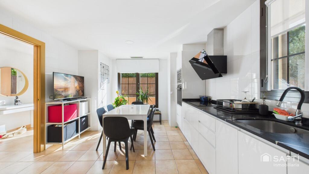 La planta principal ofrece un amplio salón-comedor de unos 45 m², muy luminoso, con acceso directo a la terraza y a la piscina privada. Una chimenea de pellets aporta calidez y confort en los meses más frescos, creando un ambiente acogedor. La cocina, amplia y funcional, se integra perfectamente en el espacio de día, ideal para disfrutar en familia o con amigos.