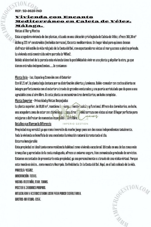 Vivienda con Encanto Mediterráneo en Caleta de Vélez Vistas al Mar y Piscina Esta acogedora vivienda de dos plantas, situada en una ubicación privilegiada de Caleta de Vélez, ofrece 169,38 m2 útiles y 220 m2 construidos (incluidas terrazas), combinando el encanto del estilo mediterráneo con las comodidades modernas. Un hogar ideal para quienes desean disfrutar del estilo de vida relajado de la Costa del Sol, con espectaculares vistas al mar y acceso a piscina. La parcela sobre la que está la vivienda es de 405m2. La ocupación de la construcción sobre la parcela es de 150m2. Dispone de piscina privada de 28,35m de agua. Planta Baja Luz, Espacio y Conexión con el Exterior Con 87,21 m2, la planta baja destaca por su distribución abierta y luminosa. El salón-comedor se integra perfectamente con el exterior a través de grandes ventanales y una puerta acristalada que da paso a una agradable zona al aire libre. En esta planta se encuentran tres dormitorios, un baño completo y prácticos espacios de almacenaje, todo ello con materiales y acabados de alta calidad en tonos claros y cálidos que potencian la luz natural. Planta Superior Privacidad y Vistas Despejadas La planta superior, de 69,89 m2, mantiene la misma armonía estética y funcional. Ofrece dos dormitorios adicionales, un segundo baño, una acogedora zona de estar con chimenea y acceso directo a una terraza con impresionantes vistas al mar. El lugar perfecto para relajarse o disfrutar de momentos especiales al aire libre. Detalles que Marcan la Diferencia Pues el detalle que más puede marcar la diferencia que es una vivienda muy versatil ya que puedes dedicarla y rentabilizarla como dos viviendas independientes. (entradas independientes y suministros). O vivir en una planta y dedicar al arrendamiento otra. TÚ DECIDES!!. Toda la vivienda se beneficia de una excelente iluminación natural durante todo el día. Versatilidad en un Entorno Inmejorable Con una distribución versátil y espacios bien aprovechados, esta propiedad es ideal tanto como residencia habitual como vivienda vacacional. Ubicada en una de las zonas más tranquilas y apreciadas de la costa malagueña, ofrece un entorno seguro, bien comunicado y rodeado de servicios. Estamos encantados de presentarle esta propiedad, ya sea personalmente o a través de una visita virtual. Porque este mundo es único... como nuestra Axarquía. En Andalucía. En la Costa del Sol. Aquí, en el lado soleado de la vida. No dejes pasar esta oportunidad, ¡las mejores oportunidades no duran para siempre!&Ven a verlo y descubre todo lo que este piso tiene para ofrecerte. Si quieres más información, no dudes en preguntarnos. En Imperio Gestión nos aseguramos de cumplir con todas las normativas vigentes en Andalucía para que puedas comprar con total tranquilidad. Contáctanos por teléfono o visita nuestra web. ¡Estaremos encantados de ayudarte a encontrar tu nuevo hogar! En cumplimiento del Decreto 218/2005, de 11 de Octubre, por el que se aprueba el Reglamento de Información al Consumidor en la compraventa y arrendamiento de viviendas de Andalucía, se informa a los clientes que los gastos notariales, registrales e impuestos que le sean de aplicación (ITP o IVA + AJD) y otros gastos inherentes a la compraventa no están incluidos en el precio. El precio sí incluye los honorarios de la gestión inmobiliaria. El consumidor tiene derecho a que se le entregue una copia del correspondiente documento informativo abreviado de la vivienda.