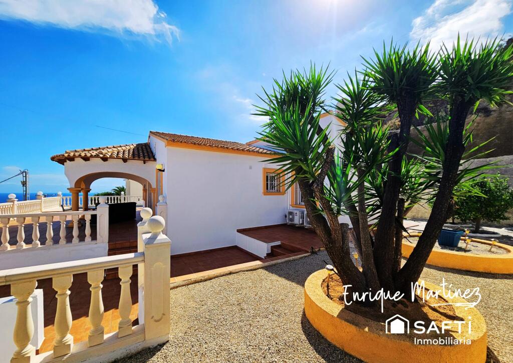Impresionante casa de dos plantas en venta en Calpe (Alicante), situada en la exclusiva zona de Cucarres, una ubicación elevada con vistas panorámicas al mar y a la montaña.