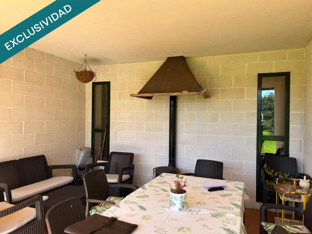 Desde este espacio, a la derecha se accede a una cocina-salón con zona de almacenamiento y lavandería. y salida directa a un porche cubierto con chimenea y vistas a la finca.