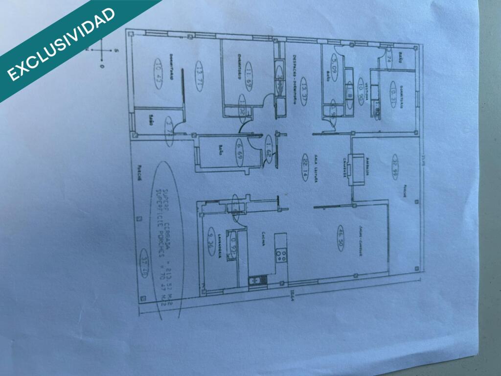 SAFTI vende en exclusiva vivienda unifamiliar de planta baja en una finca de 4.227m2, distribuidos en planta principal( de 213,58m2), bajo cubierta(de 90m2) y sótano (213,58m2).