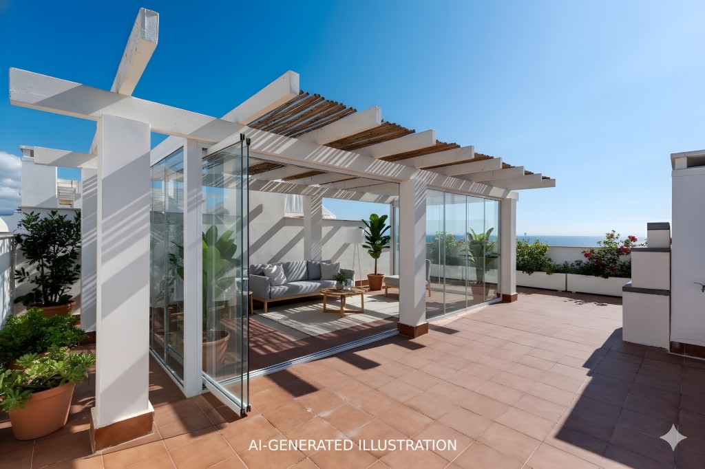 El solárium de 58m² en la azotea, equipado con una barbacoa integrada, constituye un espacio perfecto para recibir a familiares y amigos mientras se admiran las vistas.