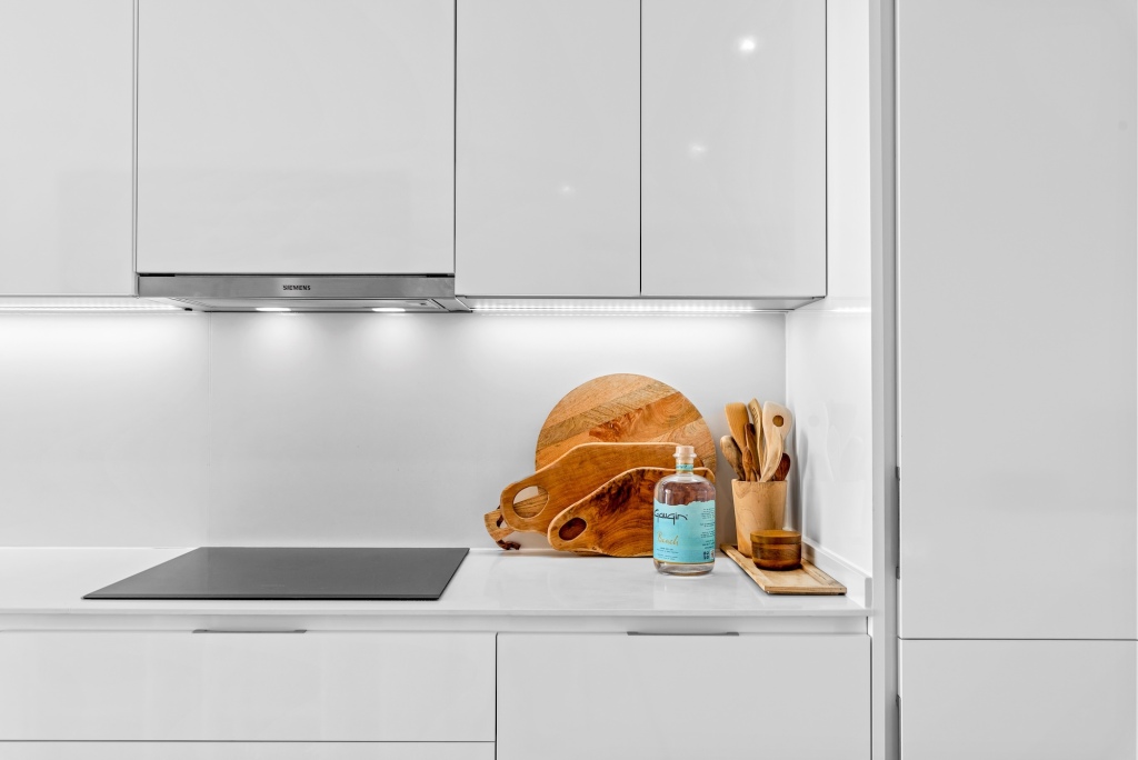 Los acabados de alta calidad en todo el apartamento realzan cada rincón con elegancia y atención al detalle. La moderna cocina abierta, equipada con electrodomésticos Siemens y una barra, es perfecta para recibir invitados y se conecta con un lavadero.