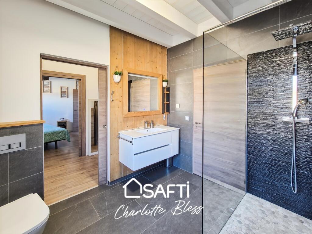 - Arquitectura contemporánea con estructura de madera y aislamiento óptimo: 15 cm de lana de madera en las paredes y 20 cm en el techo.