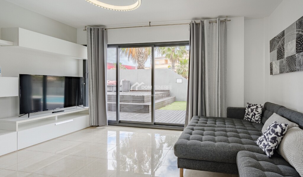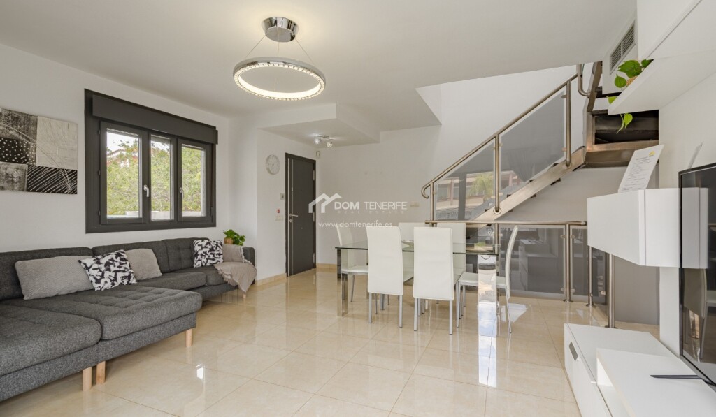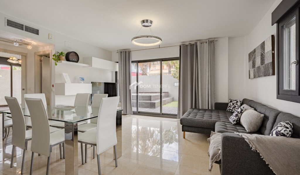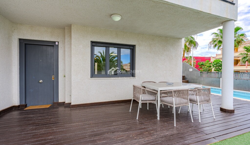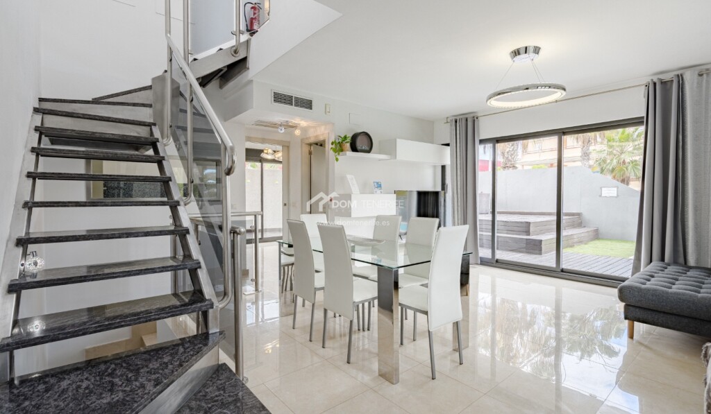 Nos complace presentar este exclusivo y encantador adosado en el corazón de Adeje, en la prestigiosa zona de El Galeón. Una vivienda que combina elegancia, confort y estilo, pensada para quienes buscan un hogar con alma.Esta propiedad ha sido completamente reformada con exquisito gusto, utilizando materiales de alta calidad y decorada con mobiliario moderno y de diseño, creando un ambiente acogedor y sofisticado.Dispone de tres amplios dormitorios, cada uno con su propio baño en suite y balcón privado, donde la luz natural acaricia cada rincón. Al acceder por su entrada independiente, te recibe un salón espacioso y luminoso, ideal para disfrutar de momentos inolvidables en familia, junto a una cocina independiente totalmente equipada y un aseo para invitados.En el exterior, un jardín cuidado y una piscina privada invitan al descanso, al sol y a la calma. Además, la vivienda cuenta con un garaje privado para dos coches.El complejo no permite licencias de Vivienda Vacacional (VV), garantizando así un entorno sereno y residencial, donde la tranquilidad es parte del día a día.A tan solo unos pasos encontrarás el Centro Comercial El Galeón, con sus tiendas, restaurantes y todos los servicios que hacen la vida más cómoda.Un lugar perfecto donde cada detalle inspira bienestar, y donde vivir se convierte en un placer cotidiano. IBI 513,82€, comunidad 60€
