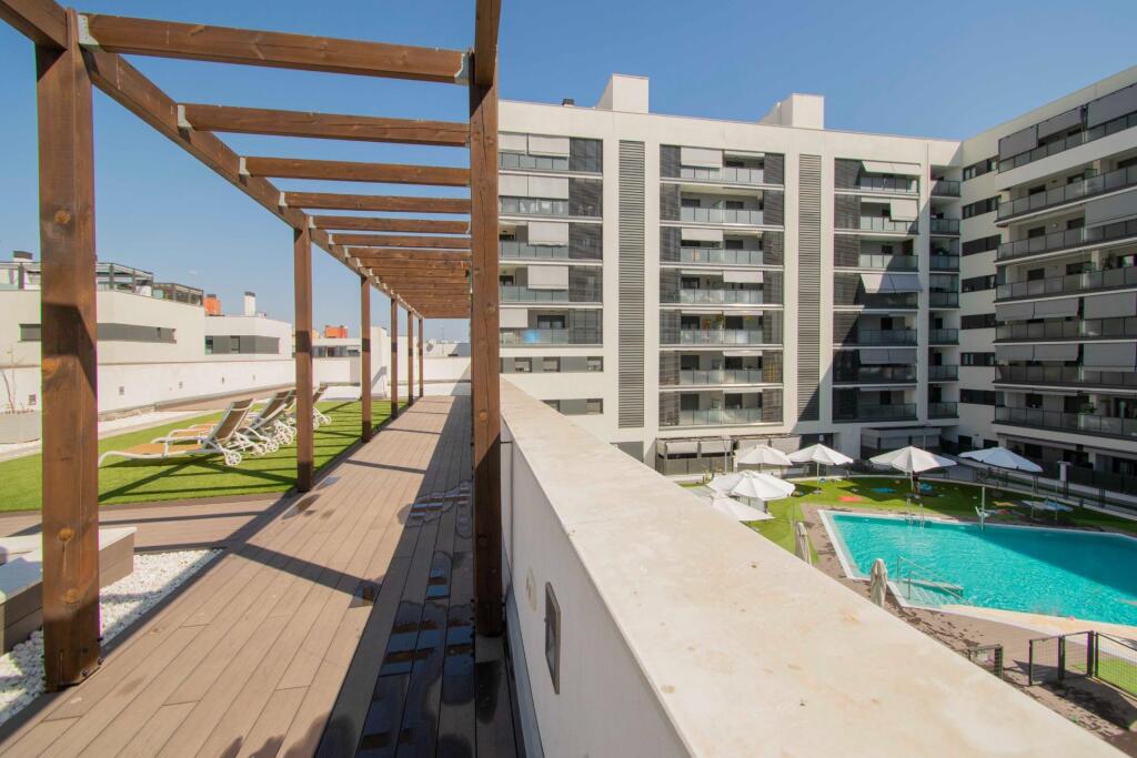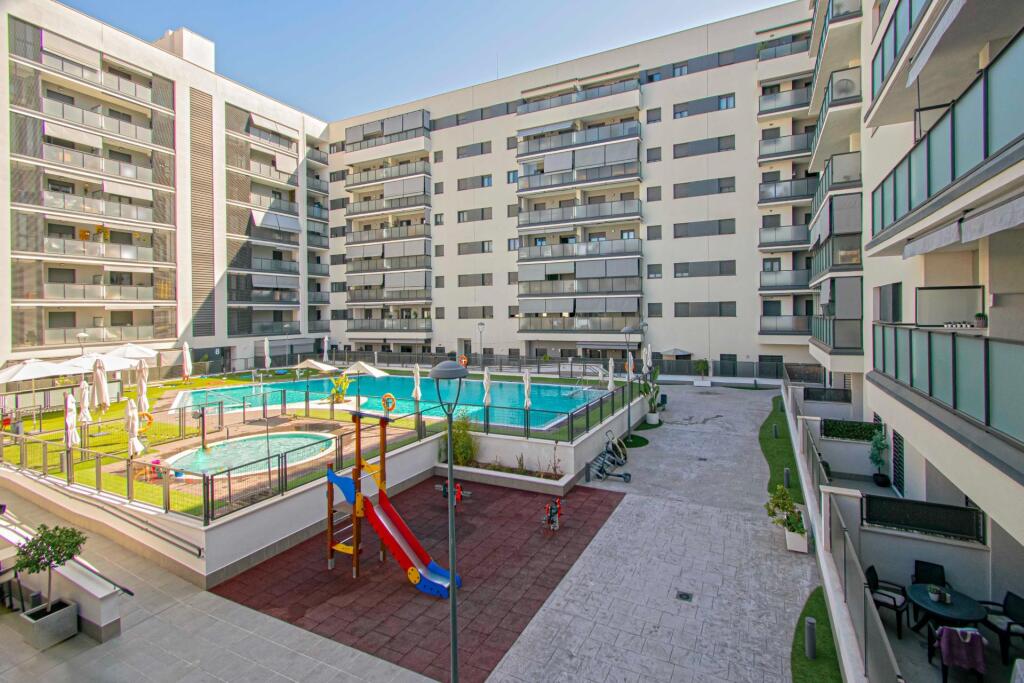 Espectacular vivienda en Residencial de Lujo en Sevilla Este, en Plena Avenida de Las Ciencias!!!LAS IMAGENES DEL INTERIOR DE LA VIVIENDA SON MERAMENTE ILUSTRATIVAS Y CORRESPONDEN A UN MONTAJE DIGITAL.Residencial Argos, un complejo de lujo en Avenida principal de Sevilla Este, con zonas comunes, piscinas, gimnasio, sala multiusos......y con todo tipo de servicios a su alcance, comercios, colegios, restauración, parques, zonas infantiles, autobuses, tranvibus, carril bici......De estilo moderno y muy actual, con excelentes calidades constructivas. El inmueble se sitúa en primera planta, consta de 130.89m2 con excelente distribución.El salón es independiente, amplio y luminoso, con acceso a amplia terraza con toldo donde podrá disfrutar de un estupendo aperitivo mirando hacia la piscina y zonas comunes de la urbanización. Con estupenda orientación Sureste, lo que le permite disfrutar de una fantástica luz natural todo el día.La cocina, de elegante diseño, también independiente, se encuentra amueblada, en tono blanco, con zona desayuno y acceso a la terraza, muy cómoda y luminosa.El piso, originariamente de cuatro dormitorios, actualmente dispone de tres, muy amplios, todos con armarios empotrados y dos baños completos, uno en dormitorio principal, con placa de ducha y el otro con bañera dando servicio a los otros dormitorios.Las ventanas son de climalit de aluminio lacado en gris oscuro con persianas, las puertas de paso de madera lacada en blanco, la de entrada acorazada, el suelo de tarima imitación madera y gres de alta calidad en cocina y baños. Dispone de aire centralizado frío calor y placas fotovoltaicas en la azotea visitable que minimizan el gasto de luz. Además cuenta con amplia plaza de garaje y trastero.Vivienda prácticamente a estrenar, exterior y muy luminosa, con todas las comodidades que siempre había soñado. No dude en solicitar visita. Le va a encantar!!!Informamos a nuestros clientes compradores que el precio de venta no incluye lo siguiente: Honorarios de la agencia inmobiliaria, Impuestos (I.T.P., I.V.A. o A.J.D., en su caso) ni otros gastos de la compraventa (gastos de Registro de la Propiedad, Notaría, Gestoría ni de posible Financiación). Documento F.I.S. a disposición del consumidor según Decreto 218/2005 Junta de Andalucía.