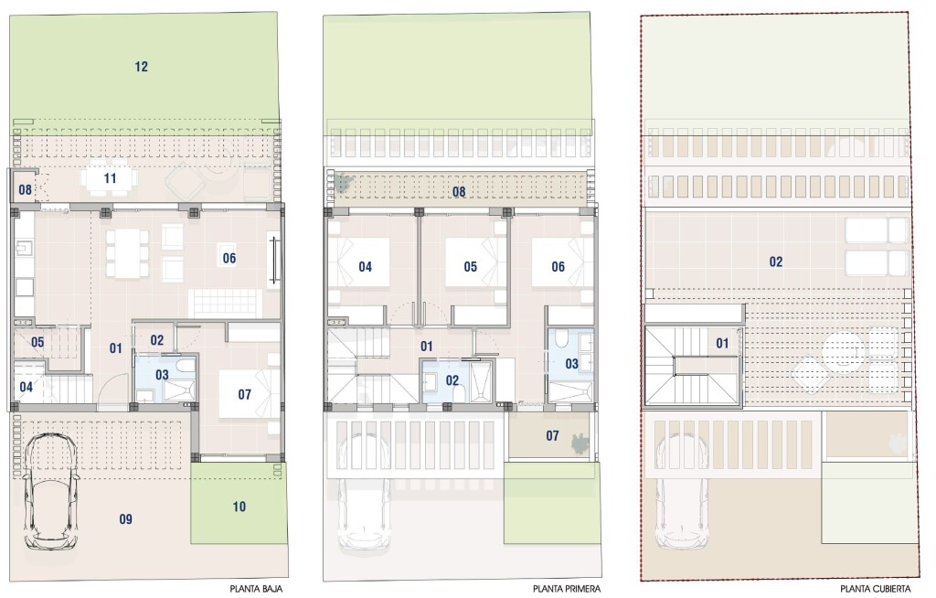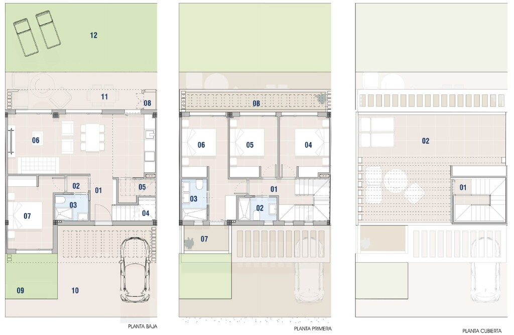 La planta baja alberga una amplia zona de día con gran luminosidad, cocina con ventilación natural (y opción de independizarla), despensa y espacios pensados para el día a día. En la planta superior, los dormitorios ofrecen privacidad y comodidad, con baño en suite y posibilidad de vestidor en el principal. Además, todas las viviendas cuentan con un solárium ideal para disfrutar del exterior en cualquier momento del año.