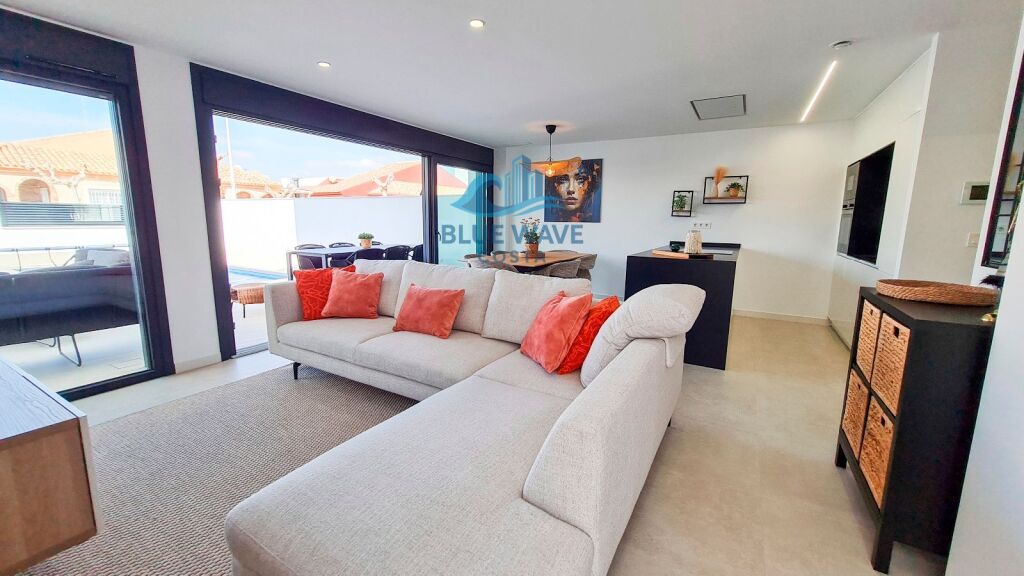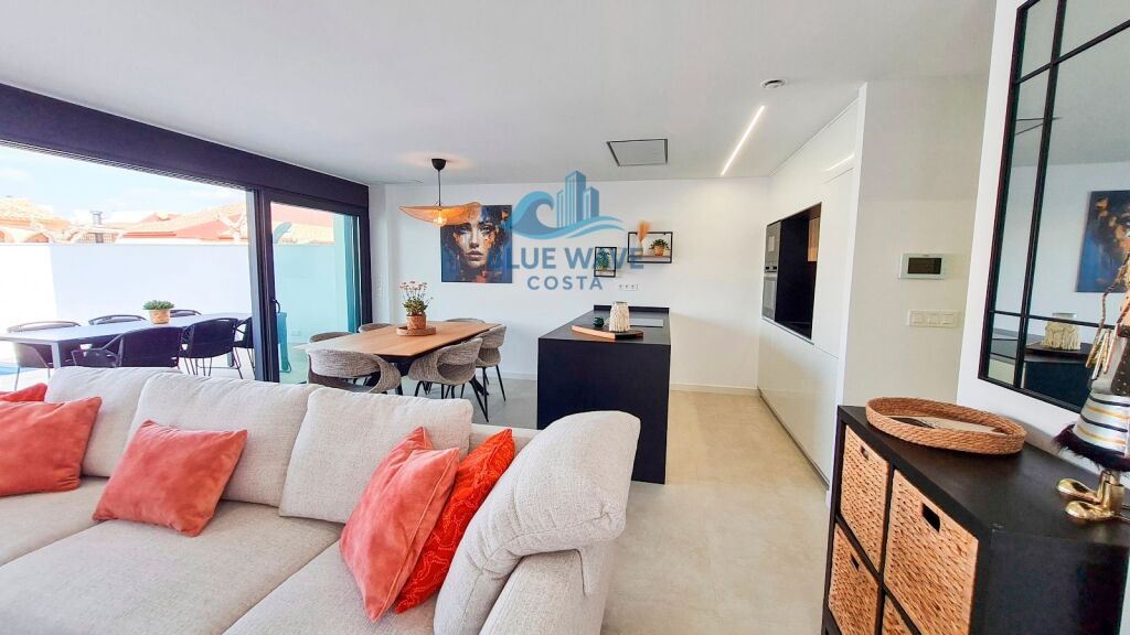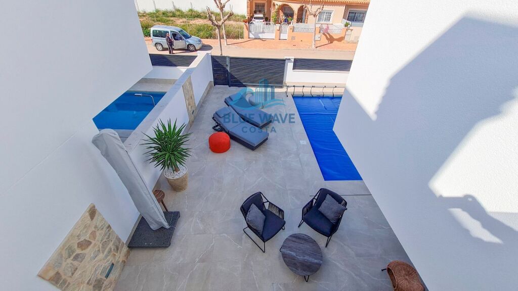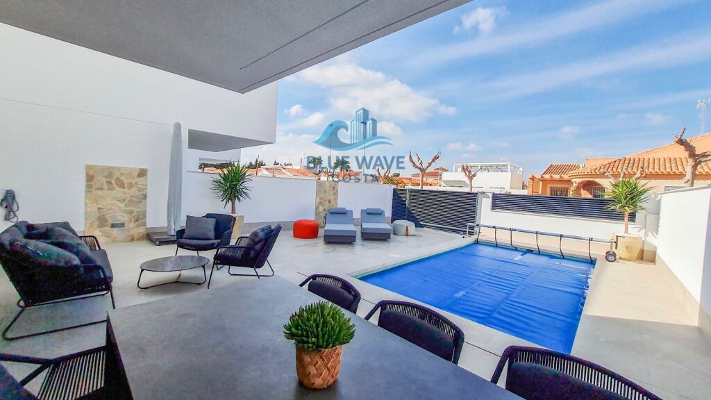Este inmueble se ubica en San Pedro del Pinatar, en la distinguida zona de Los Antolinos, una zona consolidada con servicio cercano y un entorno tranquilo junto al litoral. Se trata de una vivienda unifamiliar de dos alturas que ofrece una distribución práctica y funcional, pensada para la vida familiar. En planta baja dispone de una habitación amplia y baño completo, ideal para visitas o uso como despacho. En la parte superior se distribuyen las dos habitaciones restantes y los baños, con un diseño cómodo y bien aprovechado. La construcción se mantiene en condiciones óptimas, con acabados modernos y soluciones de confort que facilitan la vida diaria.La superficie total construida es de 112,50 m2, con 93,95 m2 útiles que optimizan cada espacio. Su distribución contempla tres dormitorios y tres cuartos de baño, lo que aporta comodidad para familias o para recibir a invitados. El salón- comedor se conecta con una terraza de 45,30 m2 y, a su vez, con un jardín de 99,77 m2, ofreciendo un equilibrio entre zonas de interior y exterior. La vivienda está equipada con calefacción por bomba de calor y aire acondicionado, garantizando confort térmico a lo largo del año. Dispone de armarios empotrados en las habitaciones y de un lavadero que facilita las tareas de la casa.La cocina, completamente funcional, está integrada en el conjunto de la vivienda y se apoya en redes de agua, luz y gas preparadas para un uso inmediato. Entre sus servicios se incluye piscina privada, que aporta un punto de valor añadido para el disfrute familiar y social, especialmente en los meses estivales. El garaje ofrece un espacio cubierto para un coche y almacenamiento adicional. El inmueble se entrega equipado, lo que facilita la mudanza y el día a día desde el primer momento. Todo ello se completa con una estética cuidada y acabados de calidad que aportan sensación de confort y funcionalidad.La zona de Los Antolinos se caracteriza por su cercanía al mar, a restaurantes, supermercados y centros deportivos, así como por su buen acceso a las principales vías de la región. Desde este enclave, se puede disfrutar de las playas de alta demanda de la zona, así como de paseos y actividades al aire libre durante todo el año. La oferta de Blue Wave Costa abarca este inmueble como una propuesta atractiva para quien prioriza una vida cómoda, con notable intuitiva para el día a día y un potencial de inversión estable en una zona en constante demanda. Si desea conocer con detalle las calidades, medidas exactas y las posibilidades de visitas, estaremos encantados de coordinar una visita. Contacte con Blue Wave Costa para concertar una cita y recibir toda la información necesaria para valorar esta oportunidad.