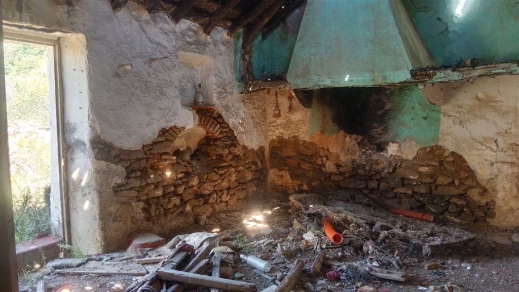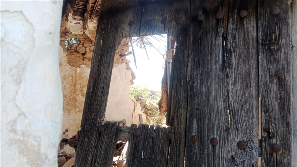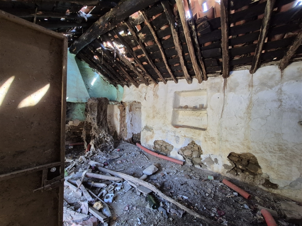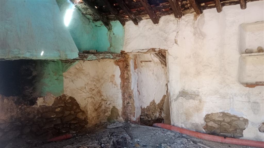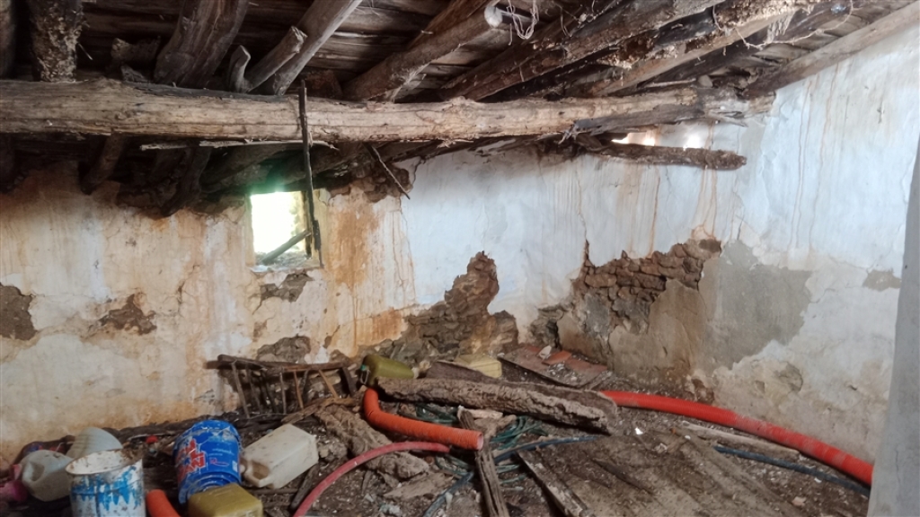 La casa tiene una parte con el tejado derrumbado y otra parte aún en pie. Está compuesta por tres habitaciones, dos de ellas comunicadas entre sí y la tercera con acceso independiente.