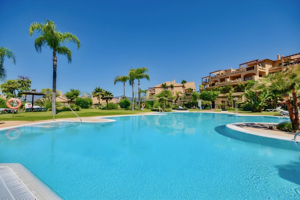 Magnífico y espacioso apartamento de 127m² en planta baja. Dispone de dos terrazas que suman 78m², parcialmente cubiertas (perfectas para disfrutarlas en todas las estaciones), con acceso directo al jardín comunitario de 140m² y con hermosas vistas al mar y a Gibraltar.