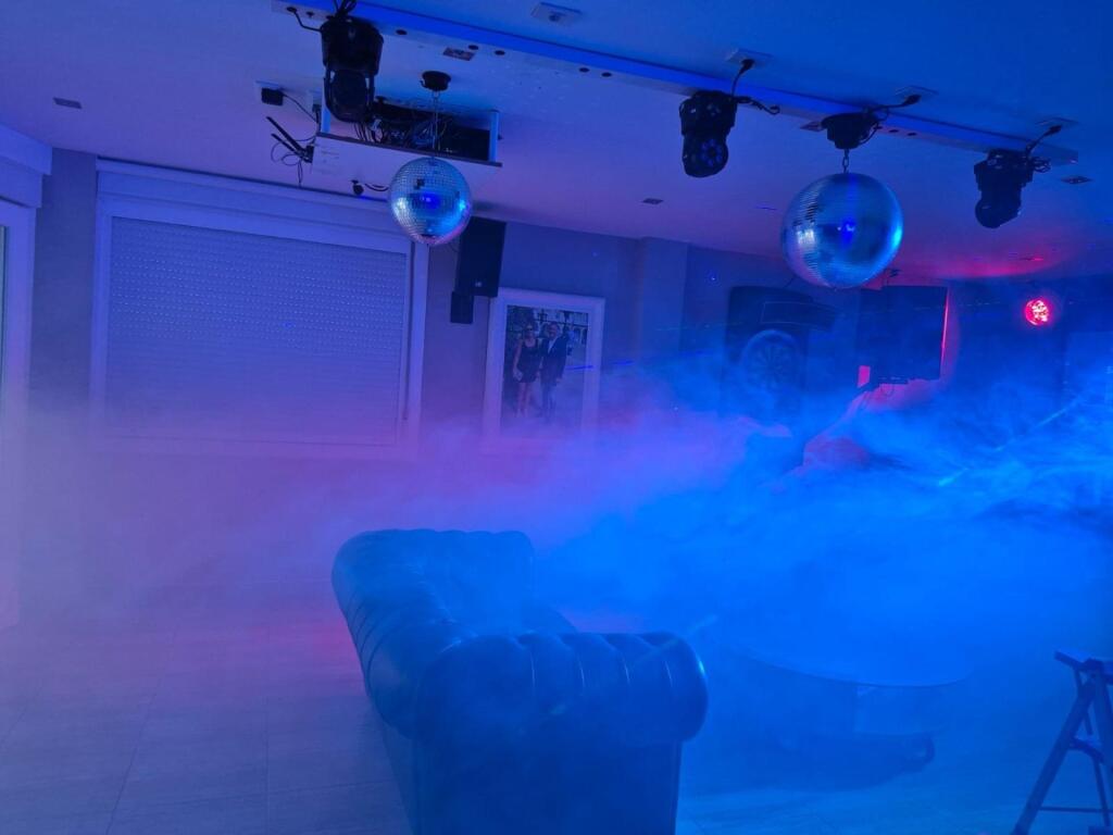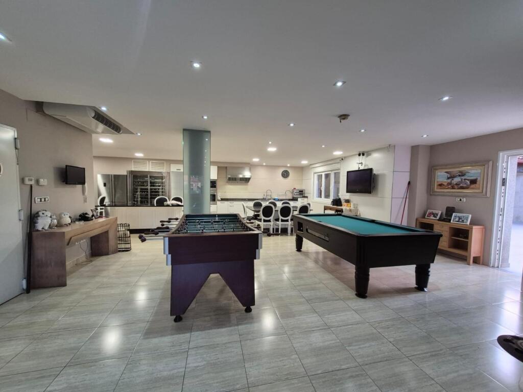 Sótano para ocio: bodega con comedor, sala de cine-discoteca, y spa con piscina climatizada, jacuzzi y acceso a un porche cubierto con chimenea.
