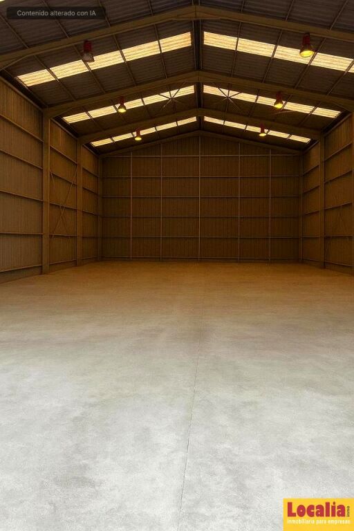 Su estructura amplia y diáfana facilita cualquier tipo de actividad industrial o de almacenaje con buena iluminación natural gracias a los lucernarios superiores. Se aprecia el espacio diáfano, el suelo en buen estado, estanterías laterales y la amplitud del acceso, lo que permite el paso de vehículos de gran tamaño sin dificultad.