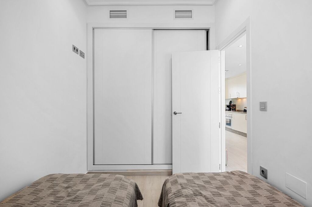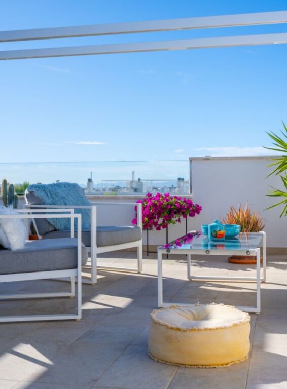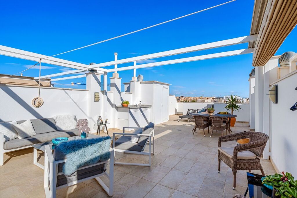 h4Este hermoso ático en Torre de la Horadada está ubicado a poca distancia de la playa, del centro comercial ¡y mucho más!/h4pEl apartamento tiene una superficie habitable de 67 m² donde se encuentran dos dormitorios dobles y dos baños modernos; uno de ellos en suite con el dormitorio principal. También hay una luminosa cocina abierta con comedor y sala de estar. Desde la cocina se accede directamente a la azotea y desde el salón a una encantadora terraza orientada al sur./ppEl apartamento está equipado con aire acondicionado central (frío/calor) y calefacción por suelo radiante en ambos baños, cocina y salón. /ppZona exteriorbrEn la entrada del apartamento hay una preciosa terraza orientada al sur con toldo retráctil y zona de estar. Desde aquí se puede disfrutar de vistas a la zona comunitaria.brEl apartamento también dispone de una amplia terraza en la azotea con espacio para varias zonas de descanso. Una parte de la terraza tiene toldo retráctil. Hay un cuarto de servicio./ppEl apartamento forma parte de un complejo residencial que cuenta con piscina, jacuzzi, gimnasio, sauna y zonas verdes./ppEl apartamento dispone de una plaza de aparcamiento privada en el garaje subterráneo./p