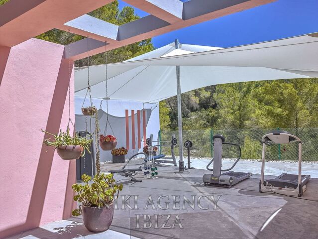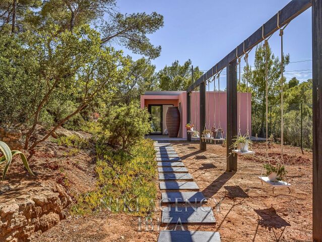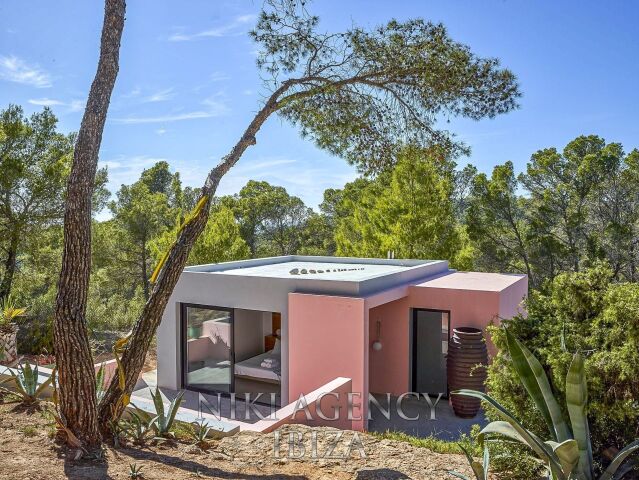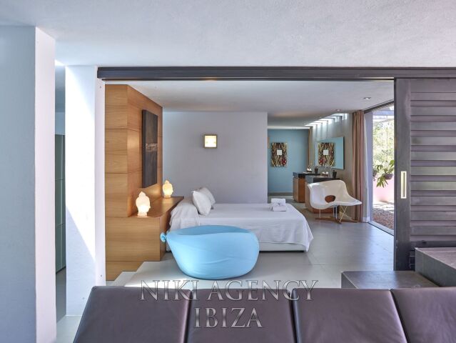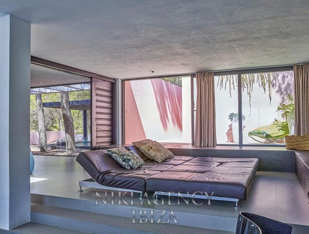 La villa destaca por su arquitectura moderna, espacios abiertos y una cuidada combinación de materiales naturales. Los grandes ventanales permiten una excelente entrada de luz natural y conectan perfectamente los espacios interiores con las zonas exteriores. Dormitorios confortables, baños de alta calidad y varias terrazas crean un ambiente ideal para disfrutar del estilo de vida ibicenco.