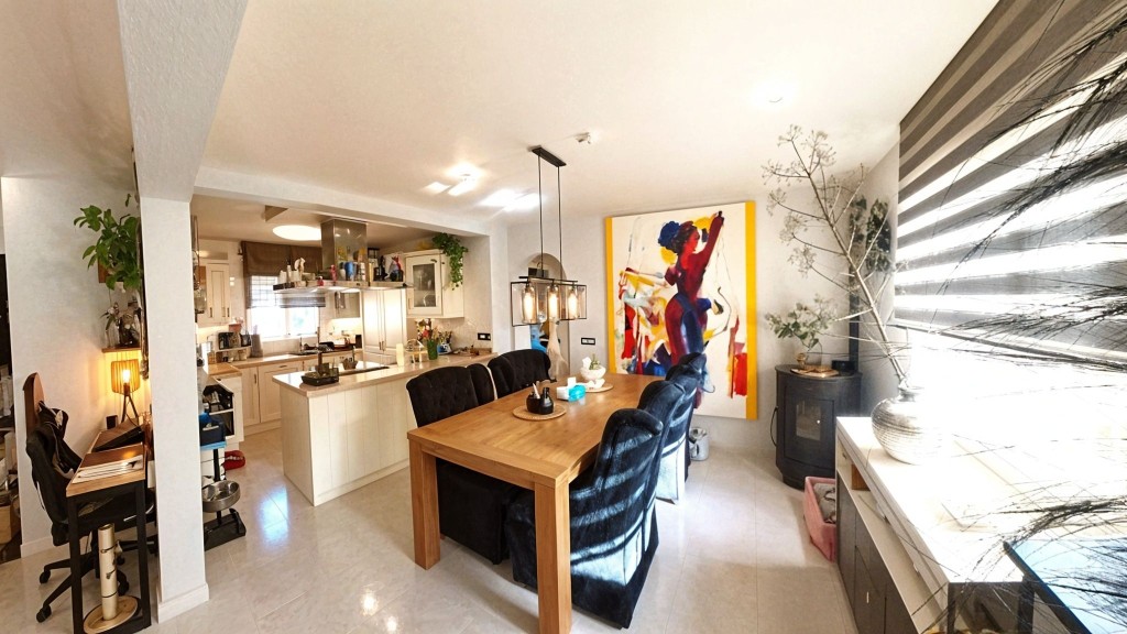La unidad principal de esta casa cuenta con suelo radiante, un gran salón con chimenea de pellets y comedor junto a cocina abierta con isla, además de dos dormitorios y dos baños, uno con plato de ducha y otro con bañera. El apartamento de invitados en la planta inferior, con acceso independiente, dispone de tres dormitorios, cocina con zona de comedor, baño con bañera de hidromasaje y trastero — áreas ideales para quienes buscan inversión en casas en venta Torrevieja o desean alojar visitantes.