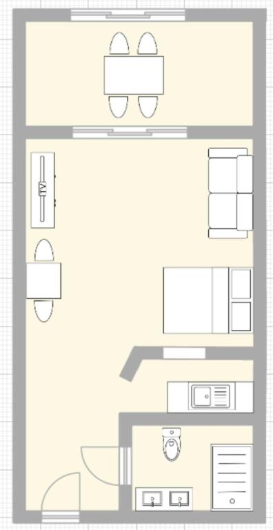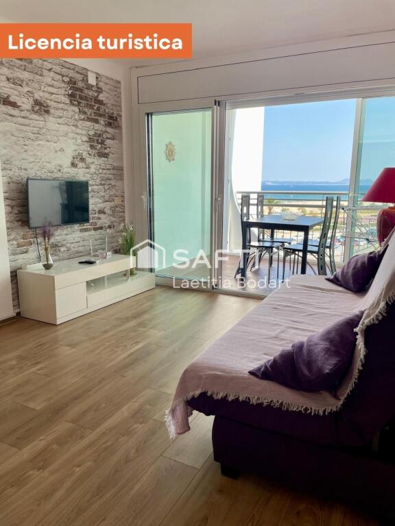 Distribución: acogedor salón con cocina equipada, baño moderno y terraza de 8 m² con vistas al mar.