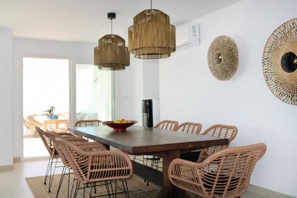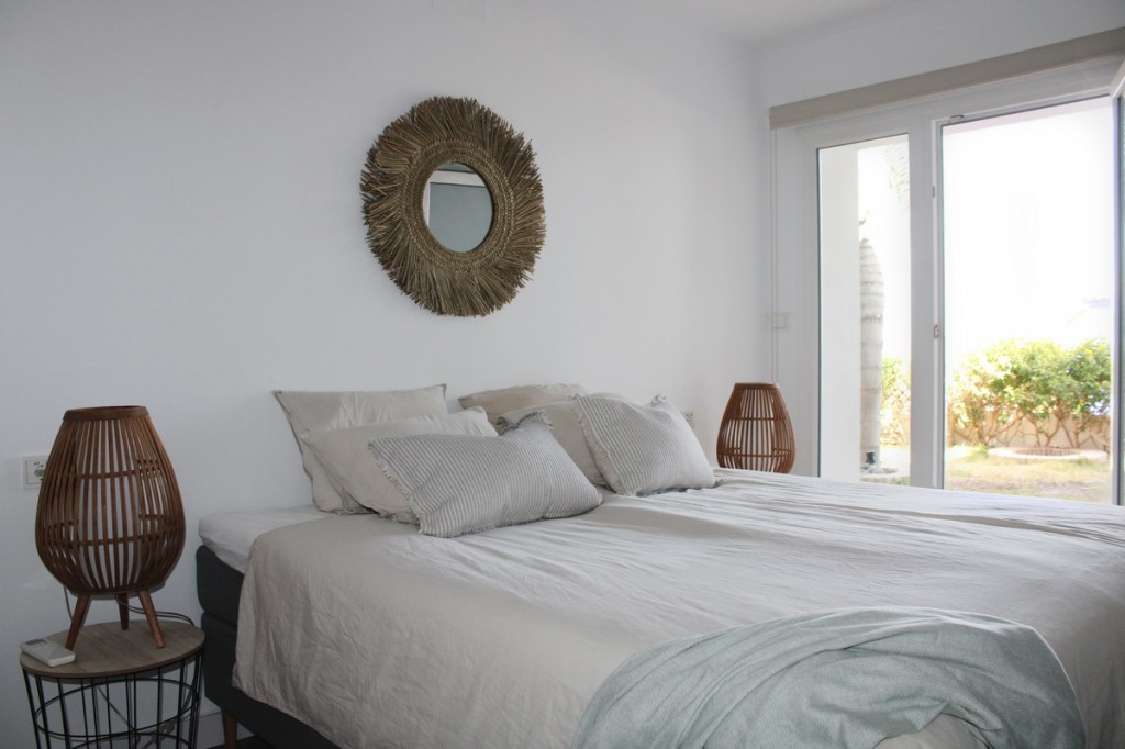 En esta misma planta está el grueso de la vivienda, además de la zona de solárium, piscina y cocina y comedor exterior tenemos cocina y comedor interior que acabamos de describir, cuenta en esta planta con 3 dormitorios, uno con dos camas individuales con cuarto de baño con ducha, otro doble con balcón privado y un dormitorio con dos literas, perfecto para los niños, amigos y visitas.