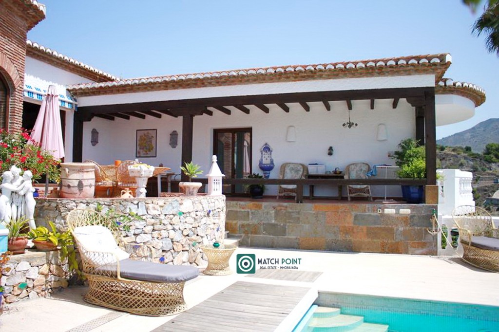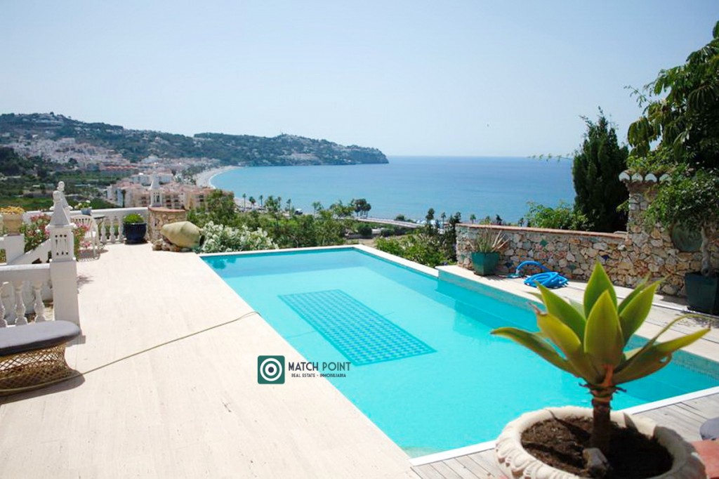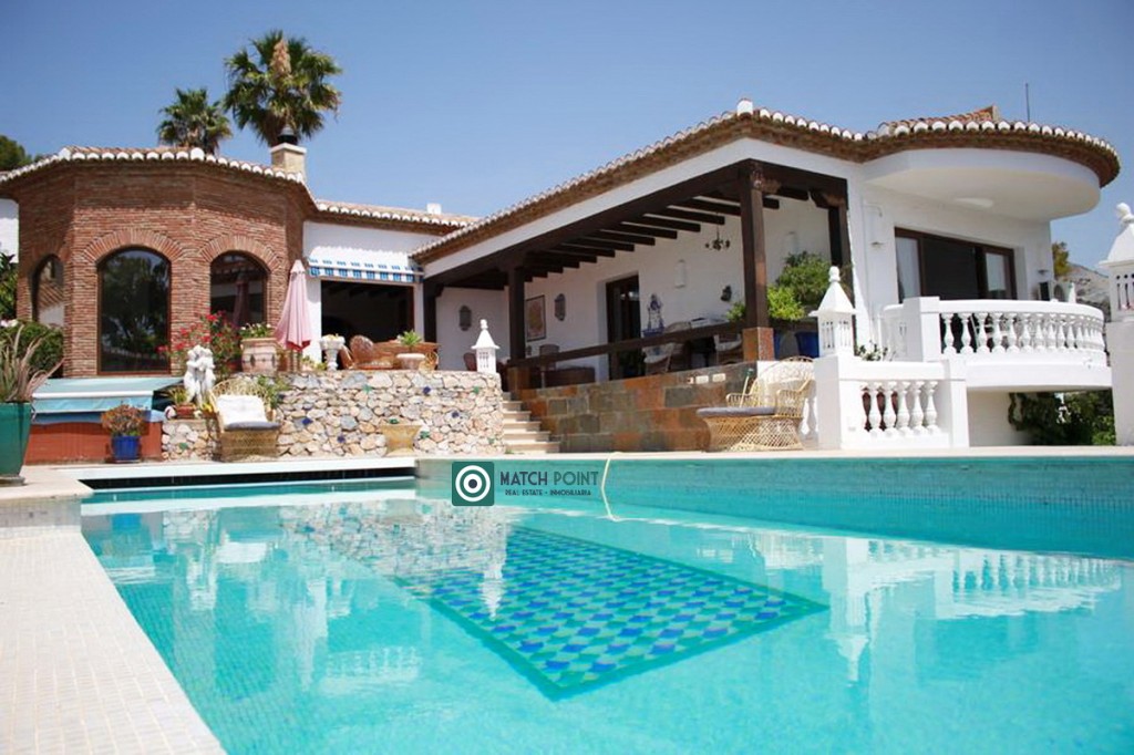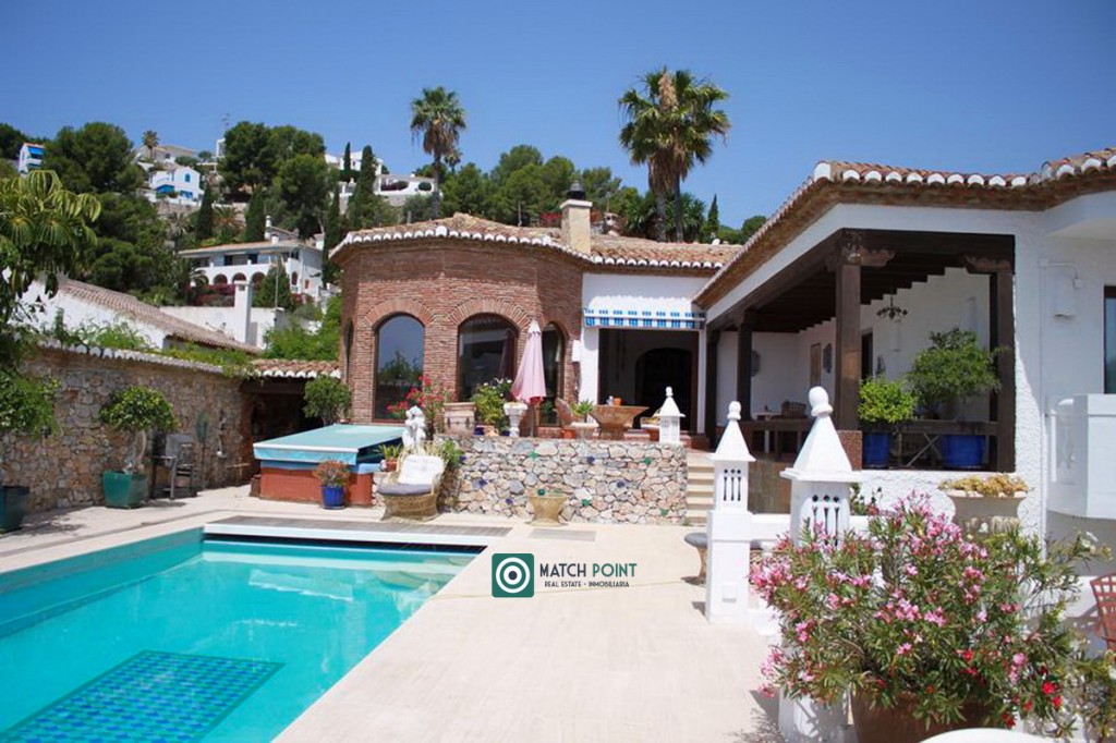En una ubicación excepcional, ya que esta casa fue de las primeras en la zona, eligiendo su primer propietario, una parcela de 940m2, que domina sobre el resto, con una vista de la bahía, la playa, el mar, el pueblo y las montañas espectacular y donde construyó esta vivienda de más de 300m2, 4 dormitorios, 3 baños, 1 aseo, un amplísimo salón con chimenea y vistas espectaculares a los más de 200m de diferentes terrazas y solárium, con diferentes ambientes, que culmina en una piscina desbordante climatizada de película, tipo “infinity” con una lámina de agua de cuarenta metros con veinticinco decímetros cuadrados (40,25 m²).