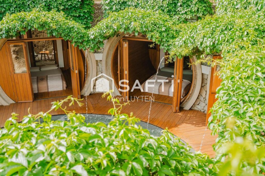 El espacio principal está compuesto por cinco suites independientes elaboradas a partir de módulos cilíndricos revestidos con materiales naturales. Cada unidad dispone de baño privado con bañera moldeada, calefacción radial e iluminación regulable. Las terrazas, que acompañan a cada dormitorio, permiten el acceso directo a una balsa de agua natural con cascada integrada, creando una experiencia de conexión inmediata con el exterior.