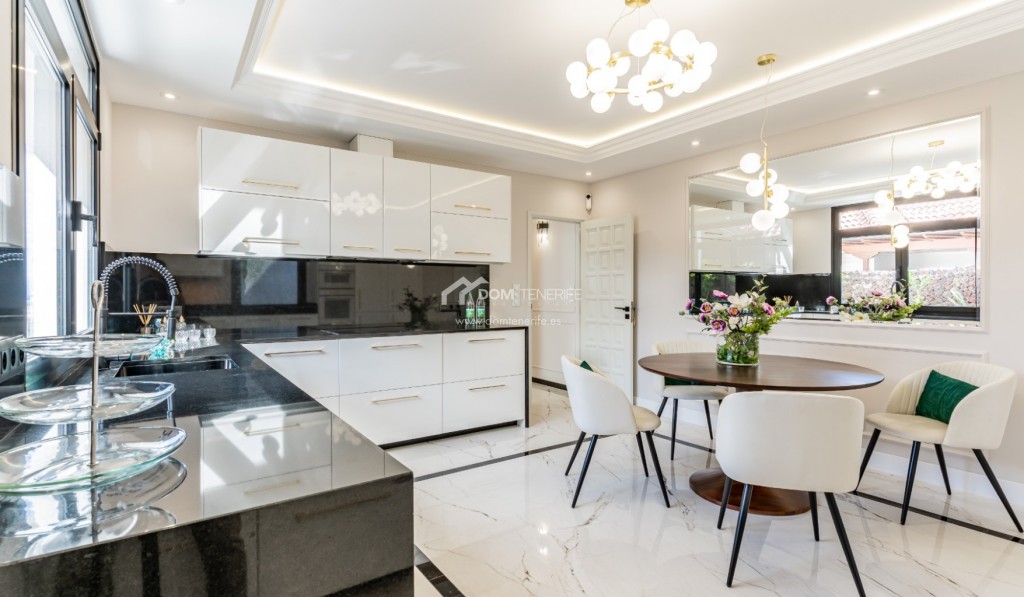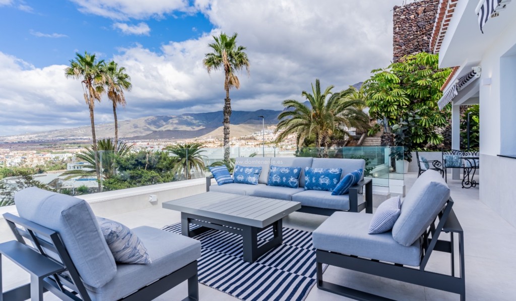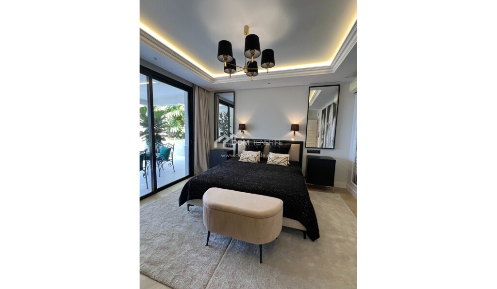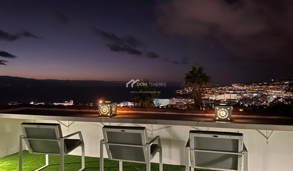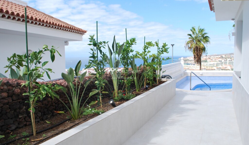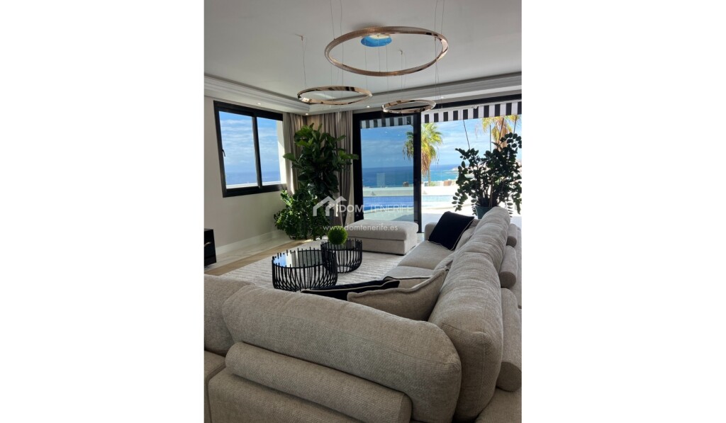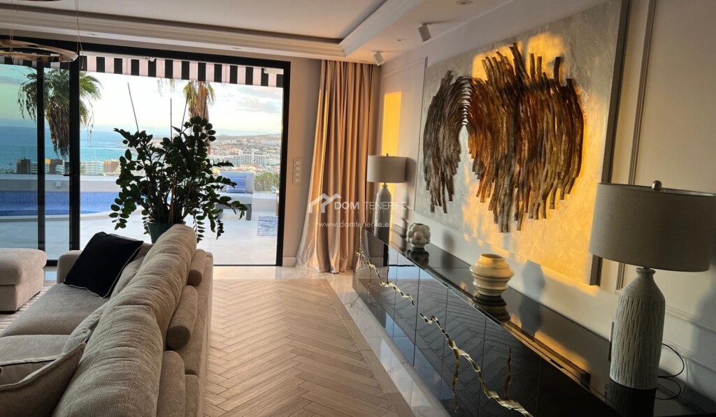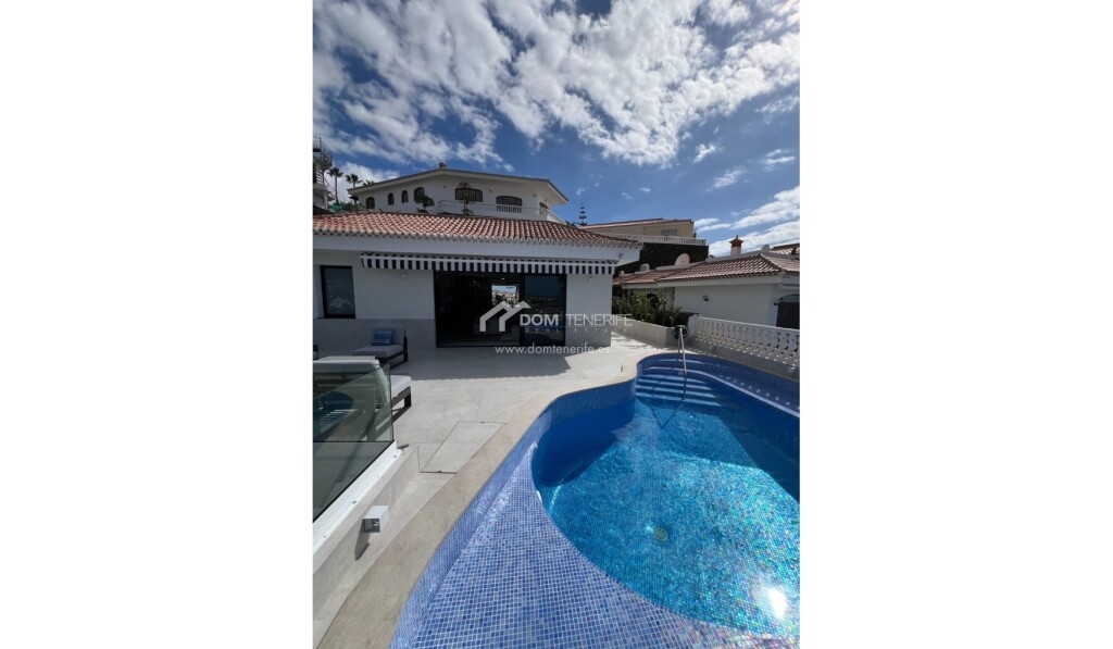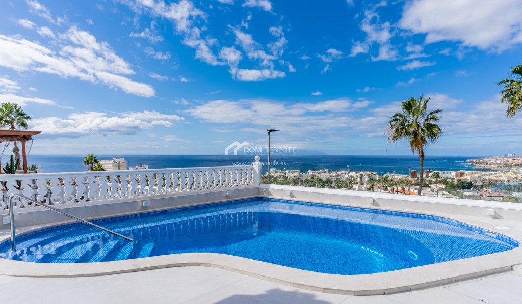 DOM TENERIFE –COMPRAR CON SEGURIDAD. Esta magnífica villa de lujo está situada en la exclusiva zona de San Eugenio Alto, en Costa Adeje, y ofrece unas vistas incomparables del océano y de la isla de La Gomera. Desde el salón, el dormitorio principal, las terrazas y la piscina privada, podrá disfrutar de un paisaje único con vista a la costa y al mar que solo una propiedad como esta puede ofrecer. La ubicación estratégica de la villa permite contemplar espectaculares puestas de sol, el azul intenso del océano y las luces parpadeantes de la ciudad, creando el escenario perfecto para disfrutar de una vida de lujo, confort y privacidad. Esta excepcional villa independiente, totalmente reformada y lista para entrar a vivir, se distribuye en dos plantas. En la entrada encontramos un garaje y un estudio completo ideal para invitados. Subiendo la escalera accedemos a la vivienda principal, que cuenta con una piscina privada, 3 dormitorios (uno de ellos en suite), 2 baños completos, un aseo de invitados, una oficina/despacho, una cocina independiente completamente equipada y amplias terrazas que rodean la casa, ofreciendo espacios perfectos para relajarse y disfrutar de las impresionantes vistas y de atardeceres realmente espectaculares. Las terrazas de la villa rodean toda la propiedad y dan acceso a la piscina. Con acabados de lujo en toda la vivienda e inmejorables vistas al mar y a La Gomera, esta propiedad representa una oportunidad única de adquirir un auténtico -pedazo de paraíso. Como joya adicional, la villa cuenta con una espectacular terraza superior tipo chill-out con vistas panorámicas a La Gomera, ideal para disfrutar de momentos inolvidables. No pierda la oportunidad de hacer suya esta excepcional propiedad. Llámame ahora para una visita.