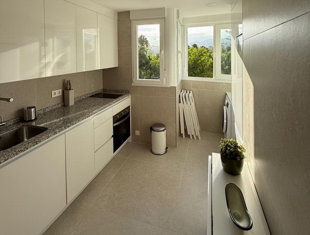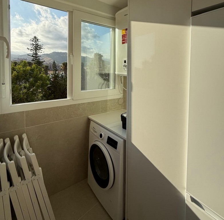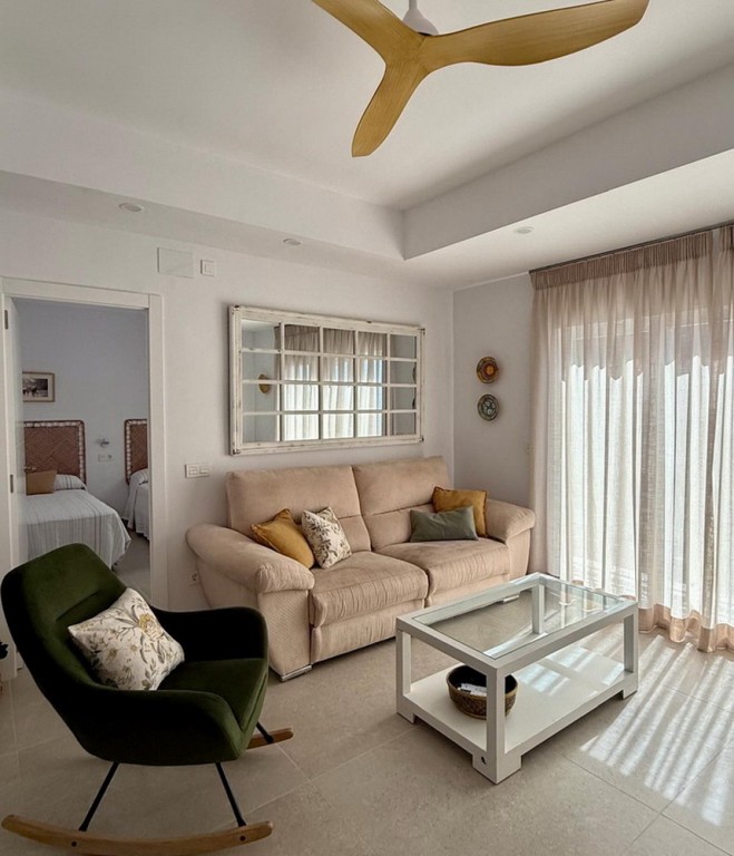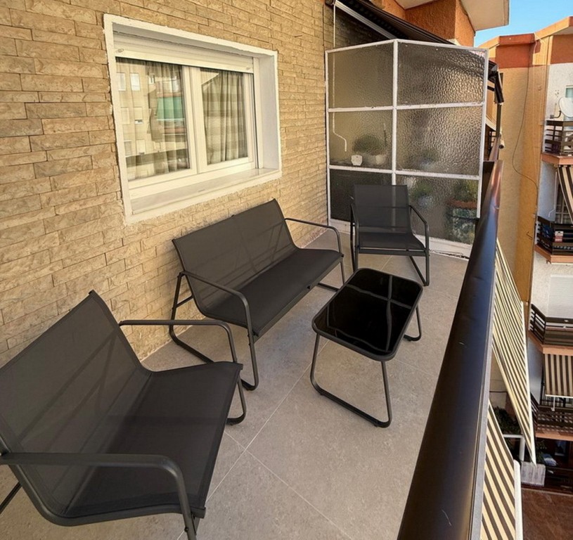 Luminoso piso de 85m2, sol de mañana y de tarde, recién reformado íntegramente, 3 dormitorios, 1 baño, aire acondicionado y ventiladores de techo, cocina independiente con lavadero, amplio salón con terraza con tres zonas diferentes, vistas al mar y a la playa.