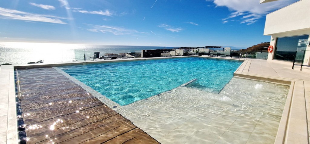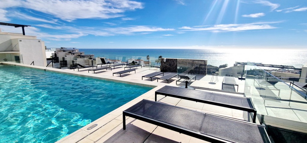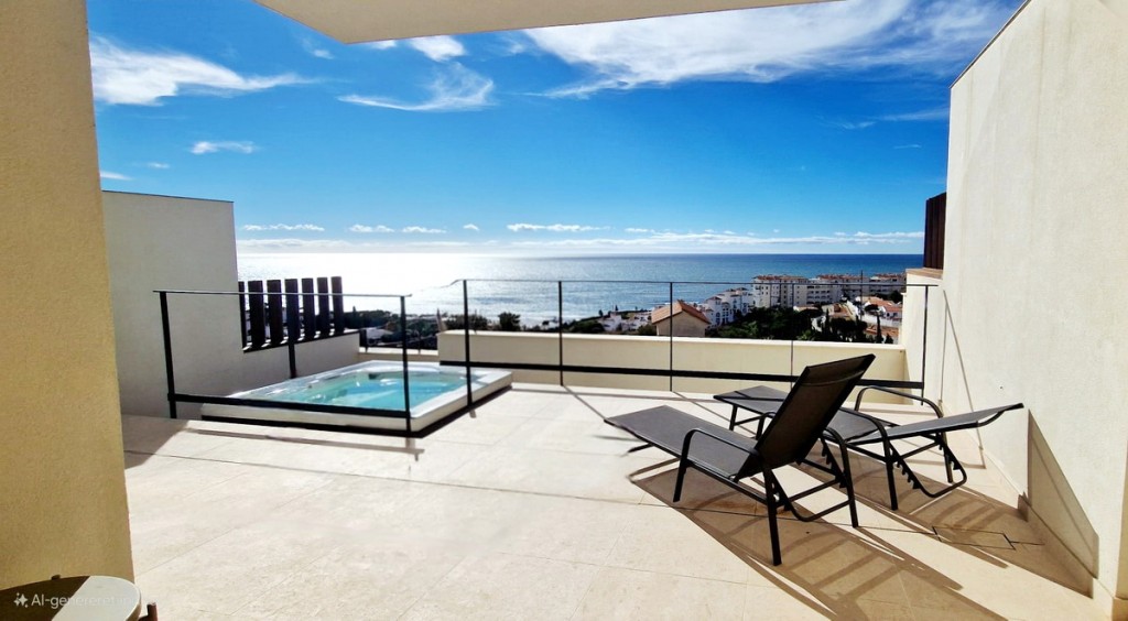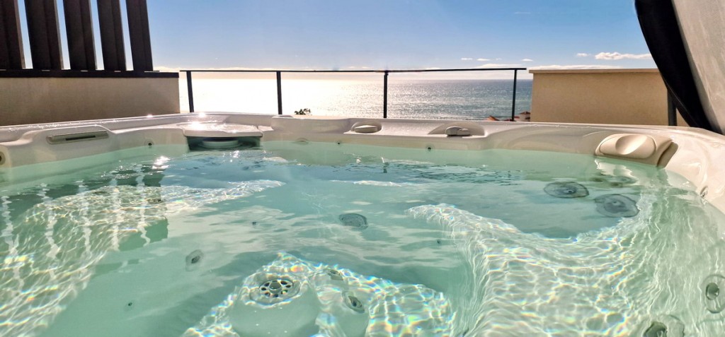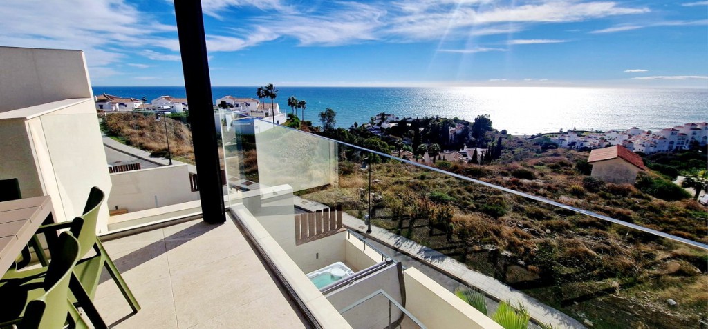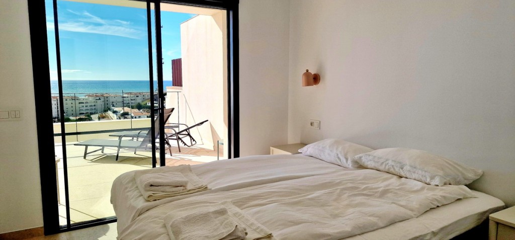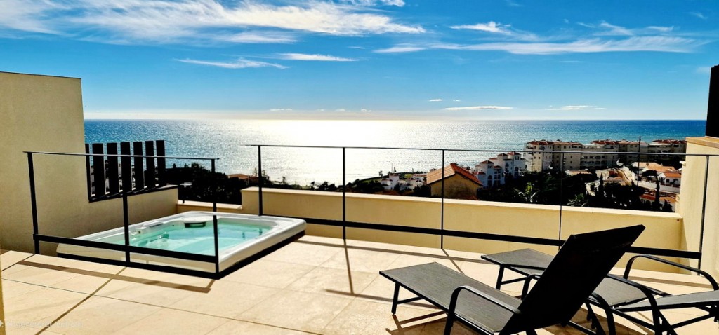 Dos de los dormitorios comparten una espectacular terraza con sus magníficas vistas y sol todo el día, donde se encuentra el spa.