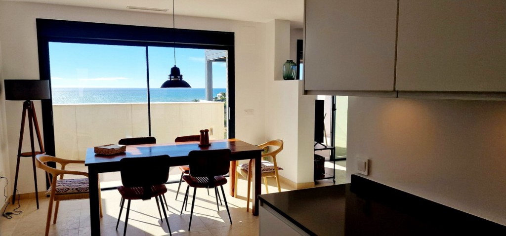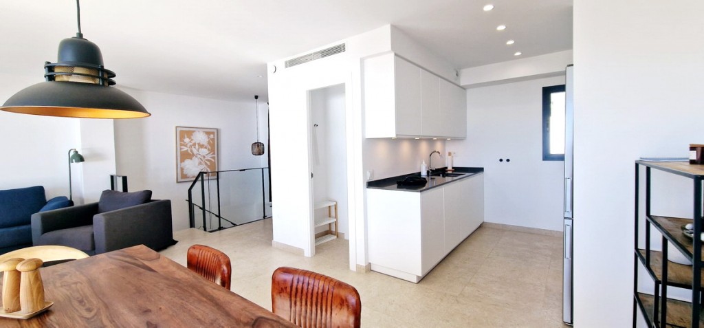 Subimos a la siguiente planta , la principal, donde encontramos la cocina, salón y una pequeña terraza, siempre todo con unas vistas increíbles de las montañas y el mar mediterráneo al fondo, y una magnifica orientación sur-suroeste que le da una luz todo el día increíble.