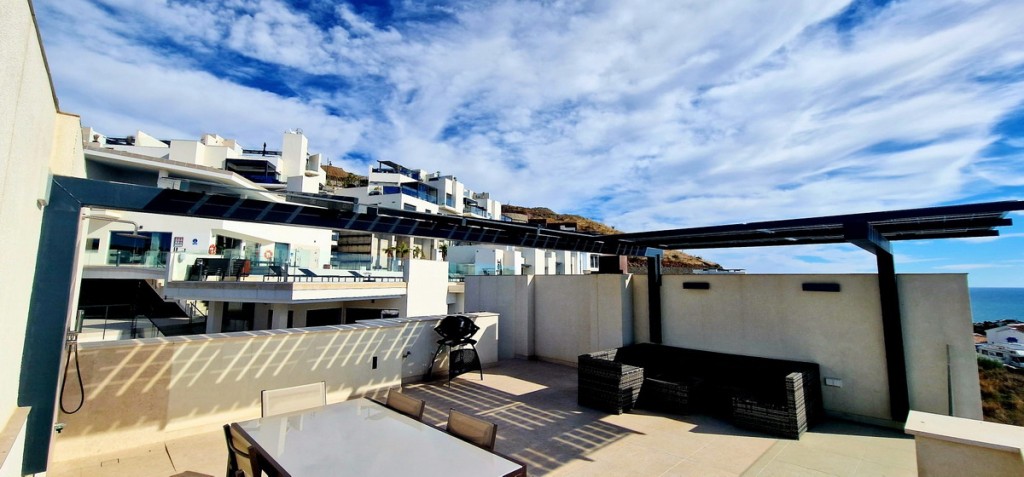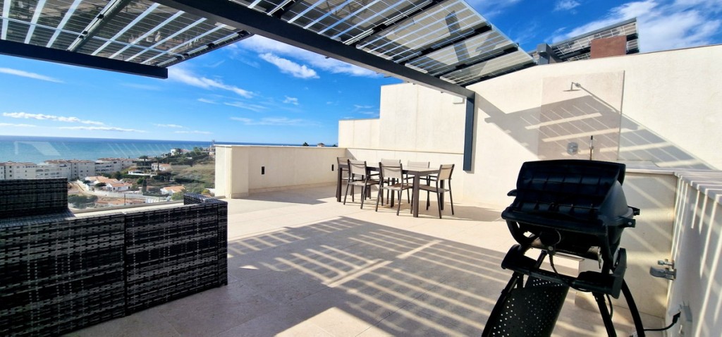 En la planta alta, una fabulosa terraza, con barbacoa y ducha, con vistas espectaculares, con amaneceres y atardeceres de película, donde disfrutar todo el año, de día y de noche, de este clima único de la Costa del Sol.