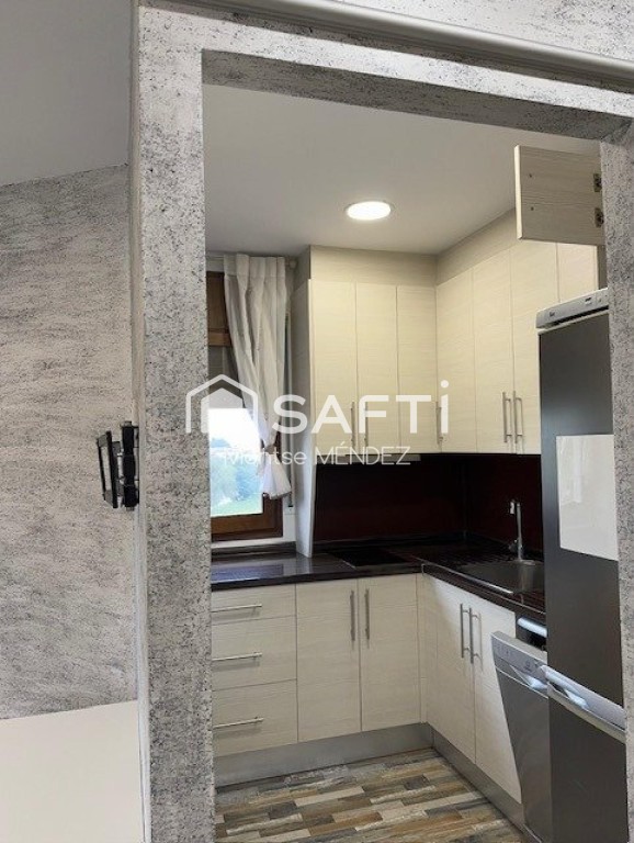 La casa se divide en dos edificaciones conectadas pero con cierta independencia. Al entrar, nos recibe un amplio recibidor que nos conduce a un acogedor salón-comedor con chimenea y grandes ventanales. Desde aquí, accedemos a una moderna cocina. En esta planta, un pequeño pasillo lleva a dos amplios dormitorios con vestidor y baño privado