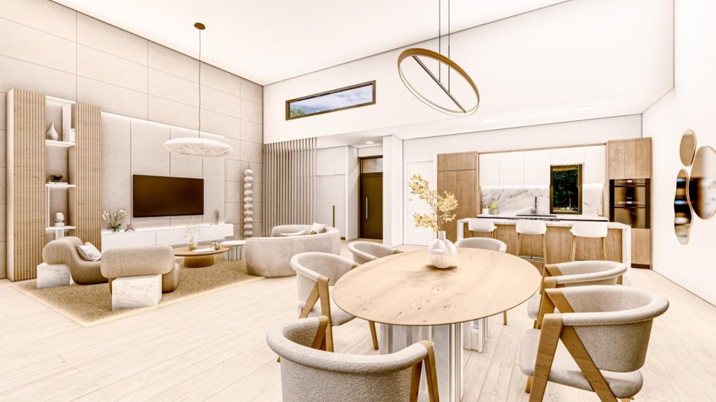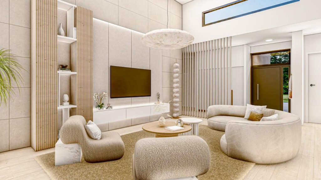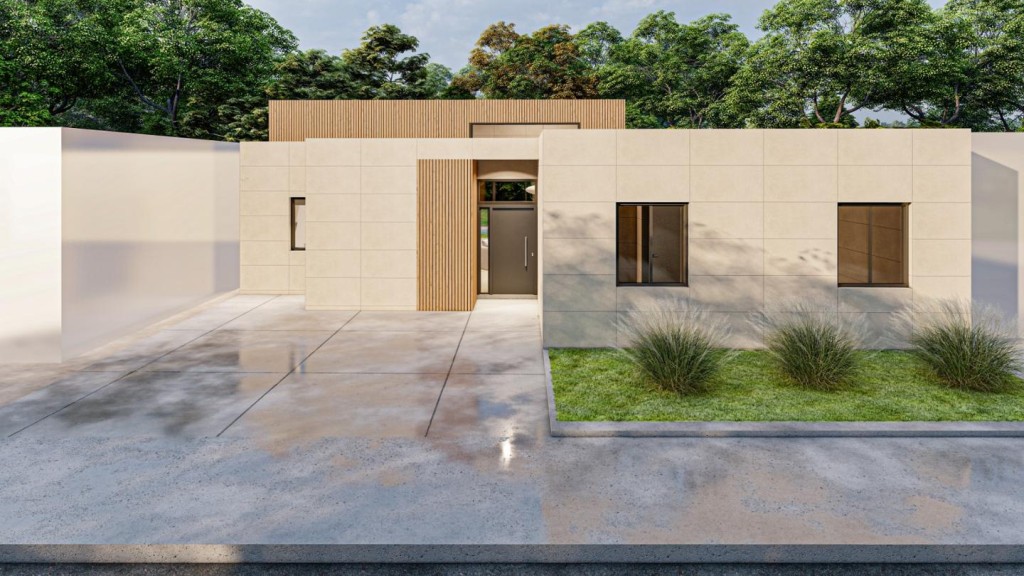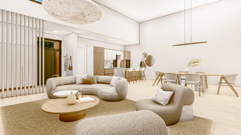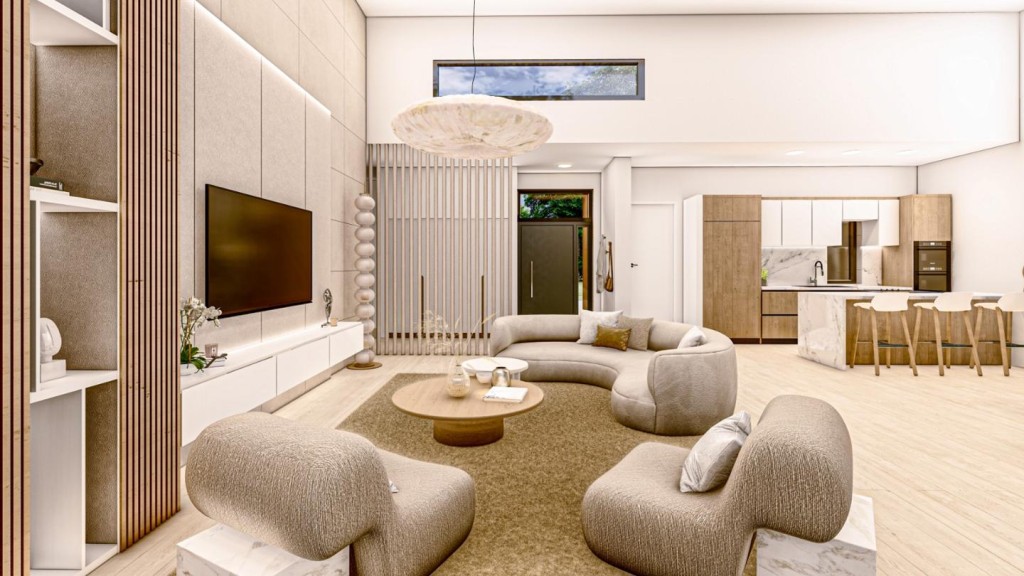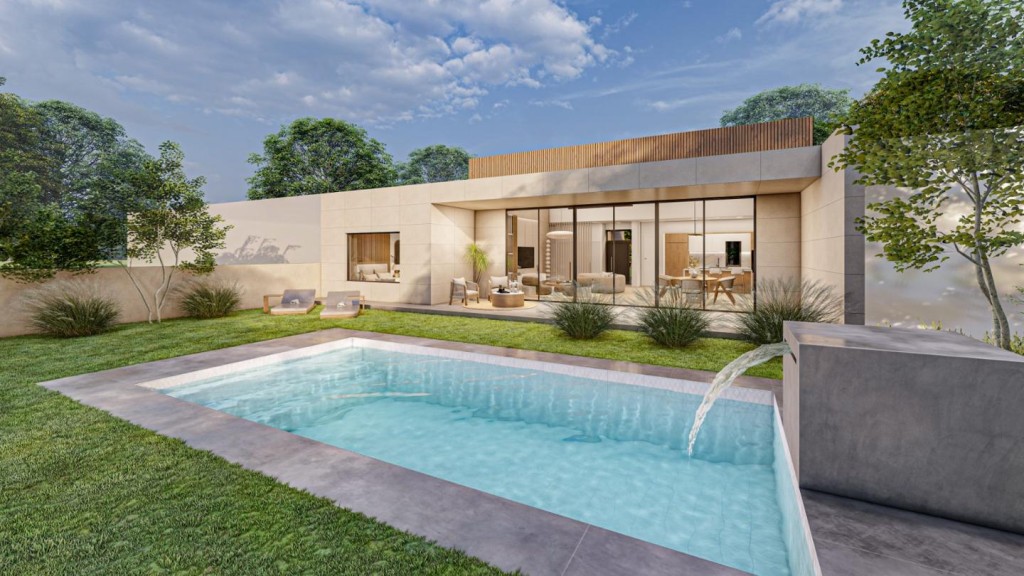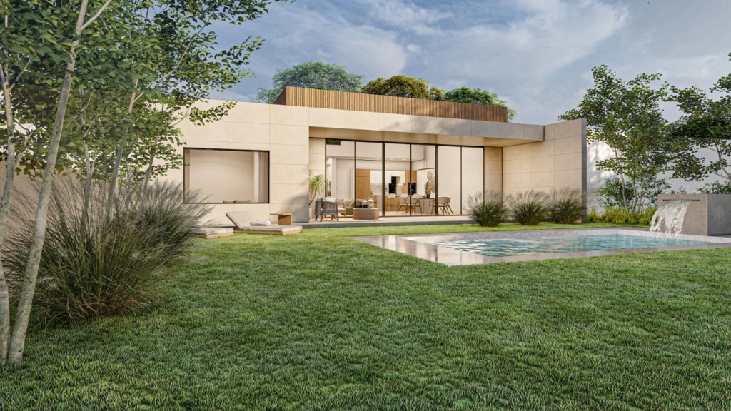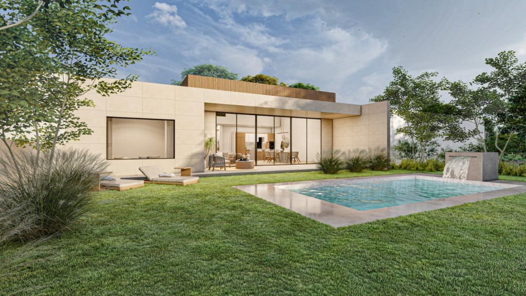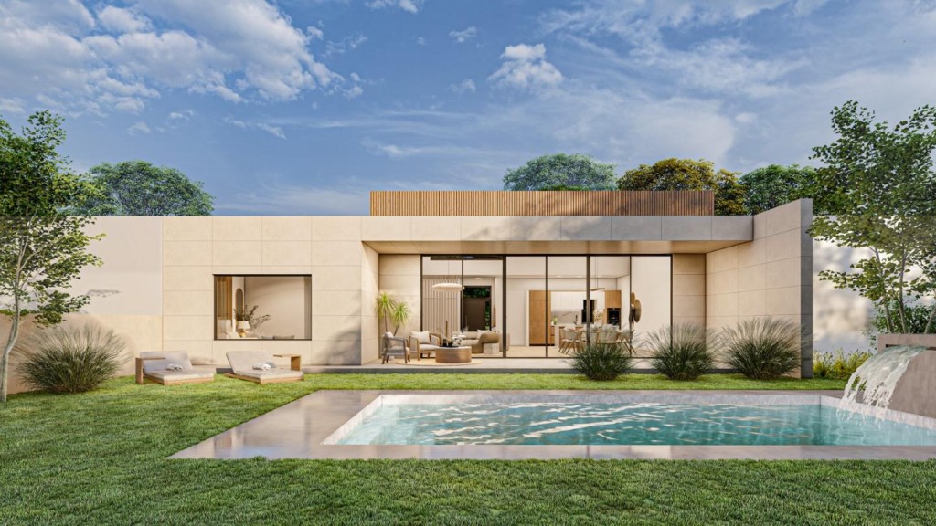 La casa se desarrolla en una sola planta y sorprende con su amplio salón-comedor-cocina de 70 m² a doble altura, inundado de luz natural gracias a sus grandes ventanales. Dispone de 3 dormitorios: una suite principal con vestidor y baño privado, dos habitaciones adicionales y un total de 3 baños (uno exterior junto a la piscina), además de cuarto de lavandería.