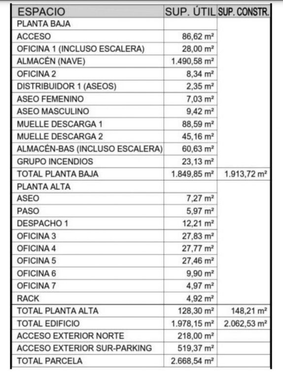 Nave de grandes dimensiones con entrada principal y otra posterior, ubicada en sitio estratégico con enorme flujo de vehículos y gran visibilidad. El edificio de la nave tiene una superficie de 2.062 m2 y un espacio posterior cerrado ideal para vehículos o carga / descarga de 606 m2, con lo cual la parcela del inmueble es de 2.668 m2 En su acceso delantero cuenta con un espacio privado (parking, o carga/descarga) de 218 m2Se compone de su edificio principal (nave) en planta baja con una distribución de almacén de 1.500 m2 aprox, dos oficinas, dos aseos (masculino y femenino), dos grandes muelles de carga, un almacén (bas), grupo de incendios (se adjuntan fotos y video), entre otros espacios, componiendo una superficie de 1.914 m2 en su planta baja. La planta superior del edificio dispone de un aseo, un despacho y cinco oficinas, además de un espacio de rack. Esta superficie en planta primera es de 148 m2Adicionalmente, se cuenta en la parte posterior de la nave (orientación sur), una espacio de 520 m2, con almacenes y zona de parking, etc. Todo el recinto del edificio está perfectamente cerrado y perimetradoSe adjuntan diferentes planos y un cuadro de superficiesSe exigirán garantías de solvencia y contrato a largo plazo*El presente documento tiene carácter meramente informativo, orientativo y no vinculante, por lo que no supone información contractual alguna, siendo su uso estrictamente comercial.