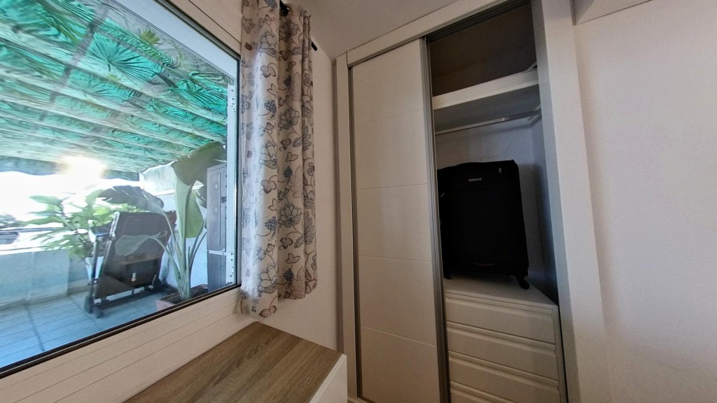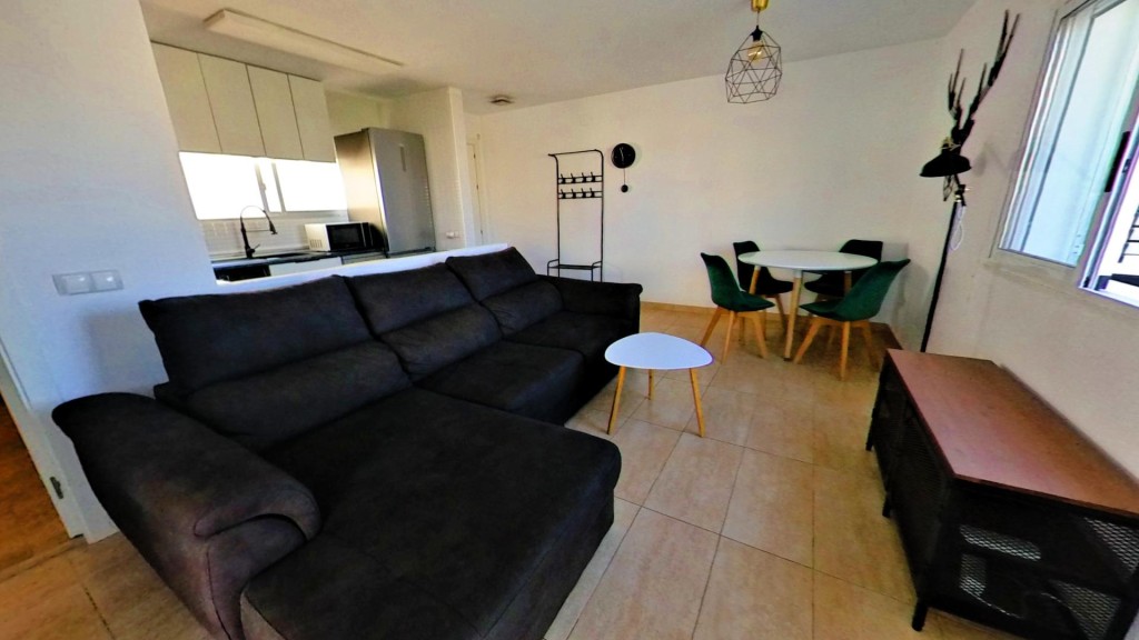 El interior es acogedor y funcional. El salón, muy luminoso, se abre directamente a la terraza, creando una sensación de continuidad entre ambos espacios. La cocina americana está equipada y aprovecha al máximo la distribución. El dormitorio cuenta con armario empotrado y el baño es completo. La vivienda ha sido reformada y dispone de ventanas climalit y aire acondicionado por split.