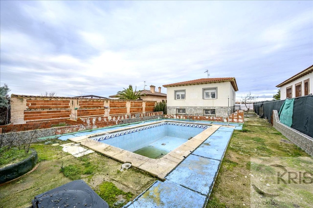 Vivienda unifamiliar independiente de dos plantas con piscina y jardín para reformar a la venta en Huecas, Toledo.