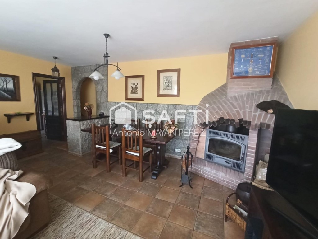 Salón-comedor abierto con chimenea y amplio ventanal.