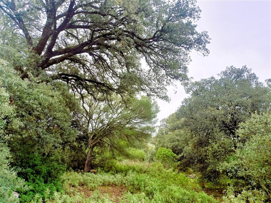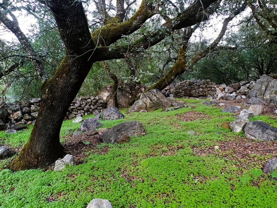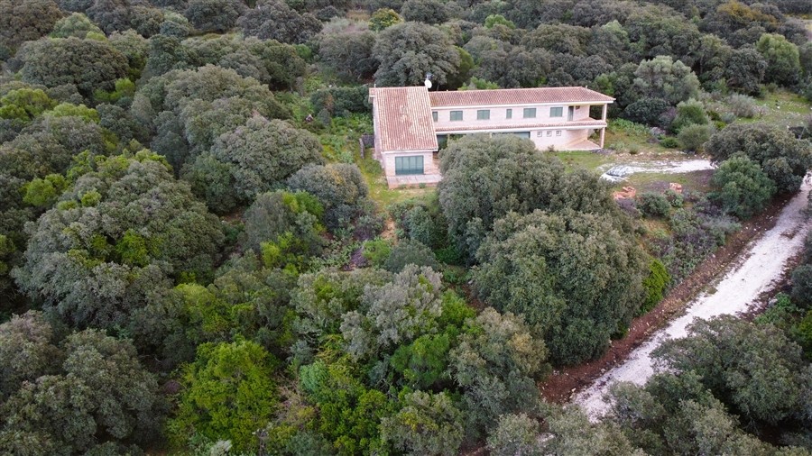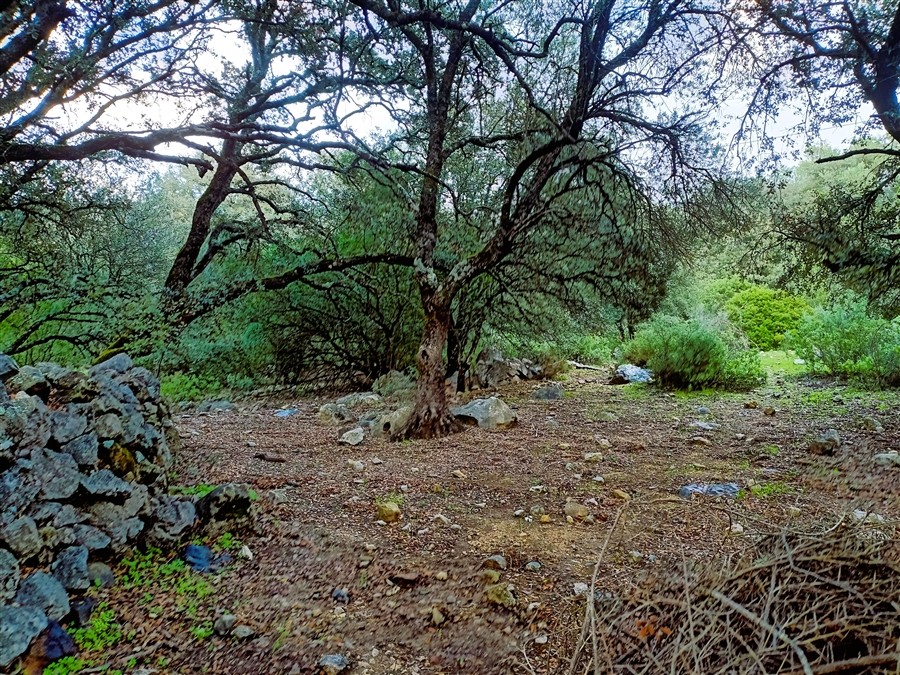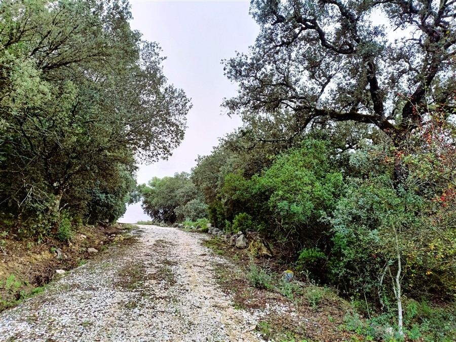 Terreno prácticamente llano. Parcela con muro de piedra perimetral, aunque no completamente vallada. La finca se divide en dos partes: una parte situada por encima de la carretera, de unos 5,5 ha, donde se encuentra la casa con unos 400 m² construidos, y otra parte por debajo de la carretera, de unos 1,5 ha.