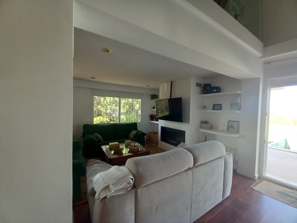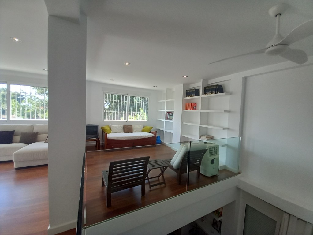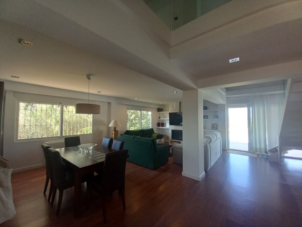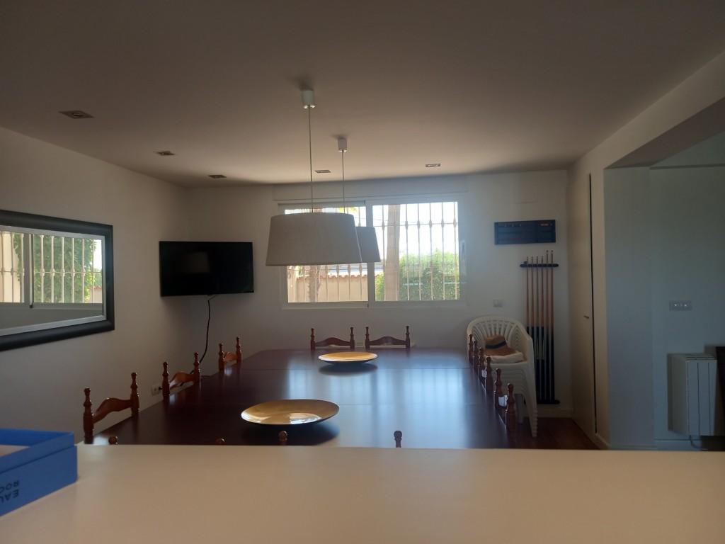 En la planta baja se encuentra un salón comedor que destaca por su chimenea y techos altos, creando un ambiente acogedor y luminoso gracias a los ventanales que permiten la entrada de luz natural en todas las orientaciones. Desde aquí, se accede a dos piscinas, una para adultos y otra infantil, ideales para refrescarse en los días calurosos. La cocina abierta, totalmente equipada, cuenta con una barra americana y una gran mesa de billar en el comedor, convirtiendo cada comida en una celebración también encuentra un baño completo de uso compartido, la habitación principal con una gran armariada y baño en suite con ducha.