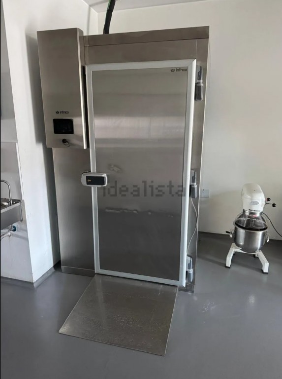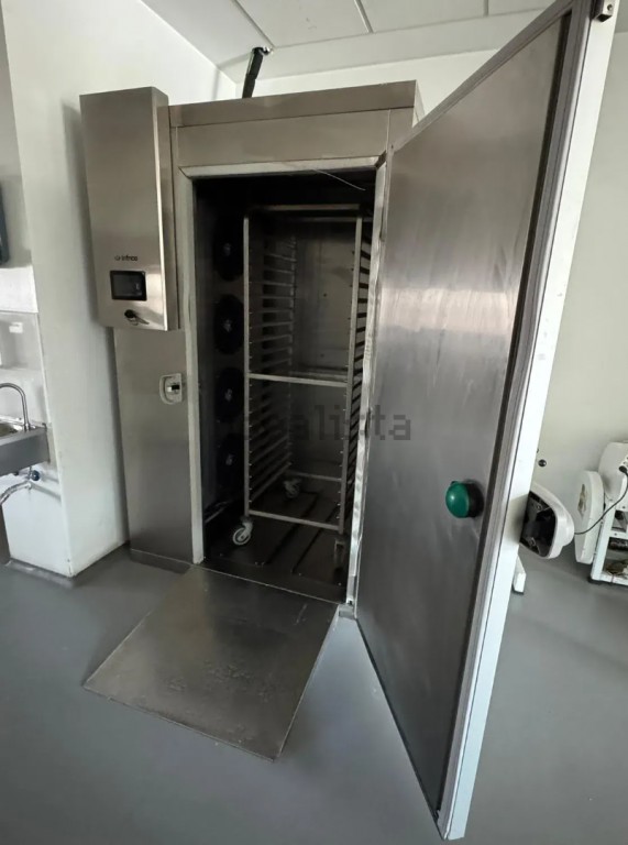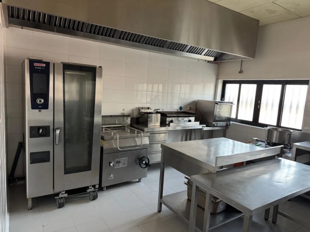 Dispone de climatización frío/calor por conductos y una distribución funcional: zona de recepción de 18 m², área de elaboración de 72 m² equipada con mesas de trabajo, tres mesas frías, laminadora MK500, abatidor Infrico ABT20 2CP, cámara de congelación panelable de 71 m³ y amasadora. Cocina de 21 m² con luz natural equipada con horno Rational iCombi Pro de 20 bandejas, sartén basculante Jemi 50L, campana mural de 4 m con sistema de extinción certificado, Robot Coupe CL50, envasadora al vacío Edenox VAKSIC-8 E, armarios de frío y congelación CORECO y lavavajillas Silanos E50, además de menaje profesional.