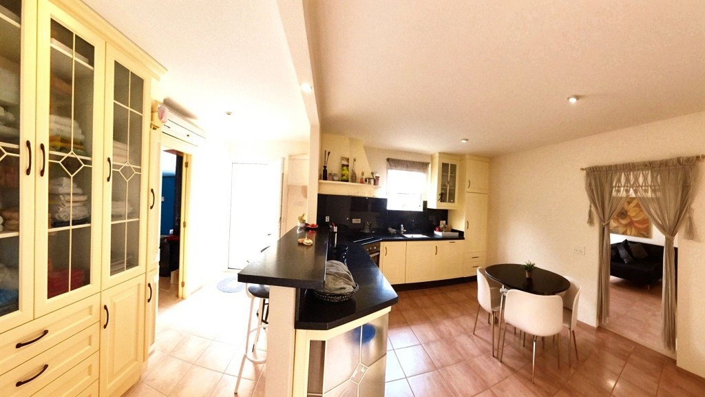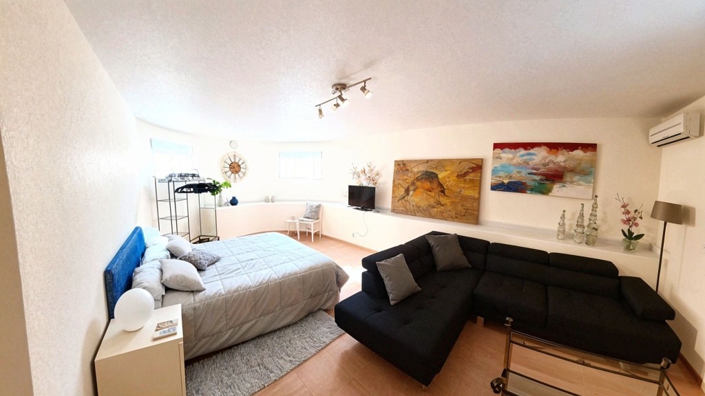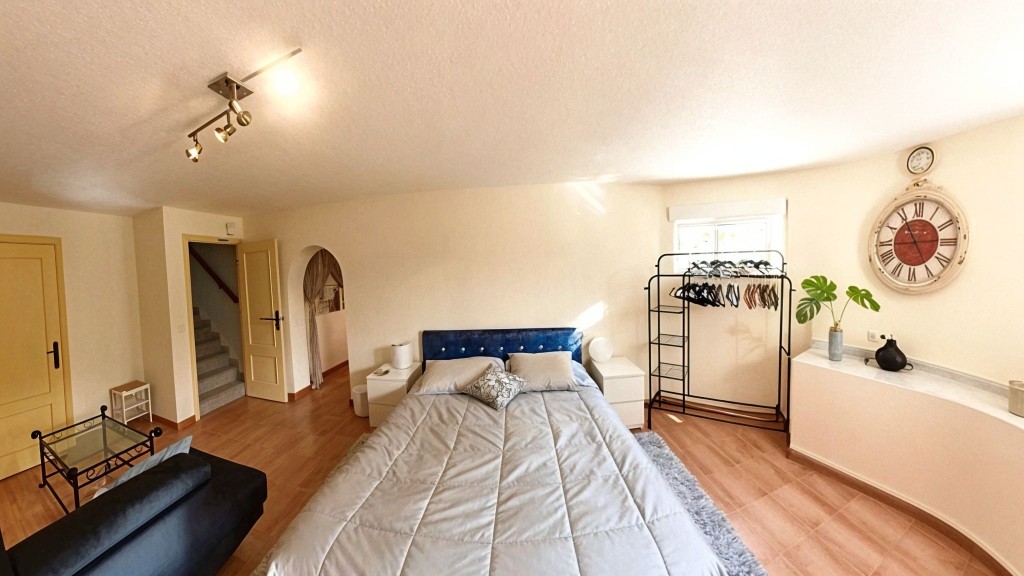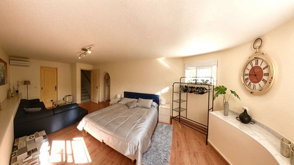 La unidad principal de esta casa cuenta con suelo radiante, un gran salón con chimenea de pellets y comedor junto a cocina abierta con isla, además de dos dormitorios y dos baños, uno con plato de ducha y otro con bañera. El apartamento de invitados en la planta inferior, con acceso independiente, dispone de tres dormitorios, cocina con zona de comedor, baño con bañera de hidromasaje y trastero — áreas ideales para quienes buscan inversión en casas en venta Torrevieja o desean alojar visitantes.