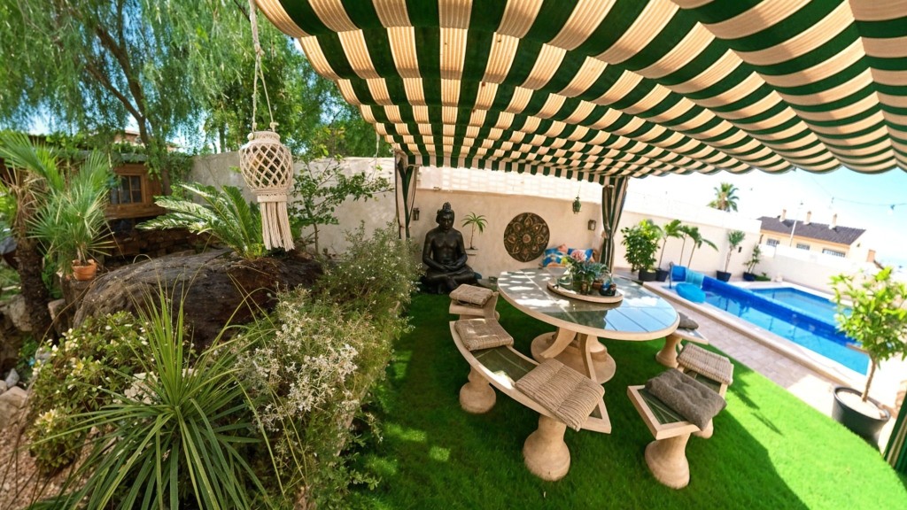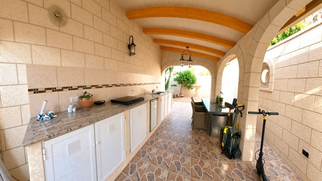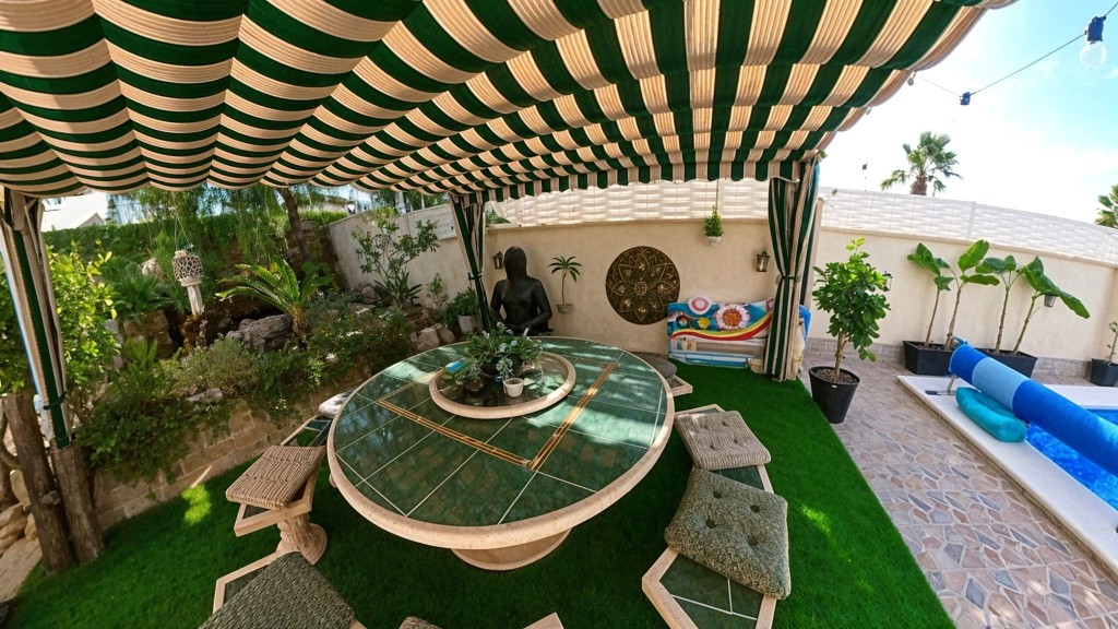 La propiedad destaca por su alta eficiencia energética con placas solares que reducen el consumo eléctrico, una ventaja buscada por clientes de real estate en Torrevieja. El exterior cuenta con cocina de verano, barbacoa, zona de relax y mobiliario para cenas al aire libre, creando el ambiente perfecto para reuniones familiares y eventos sociales. El parking privado dentro de la parcela aporta máxima comodidad, un valor añadido en la oferta de casas en venta Torrevieja.