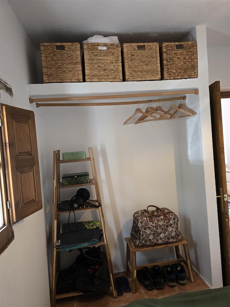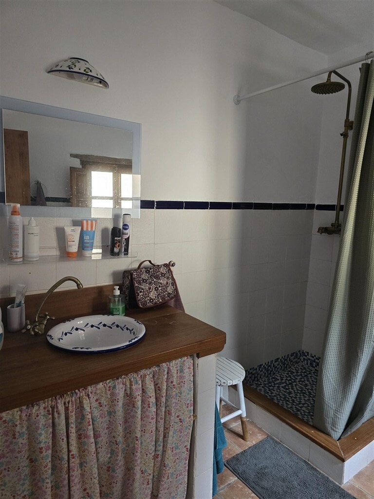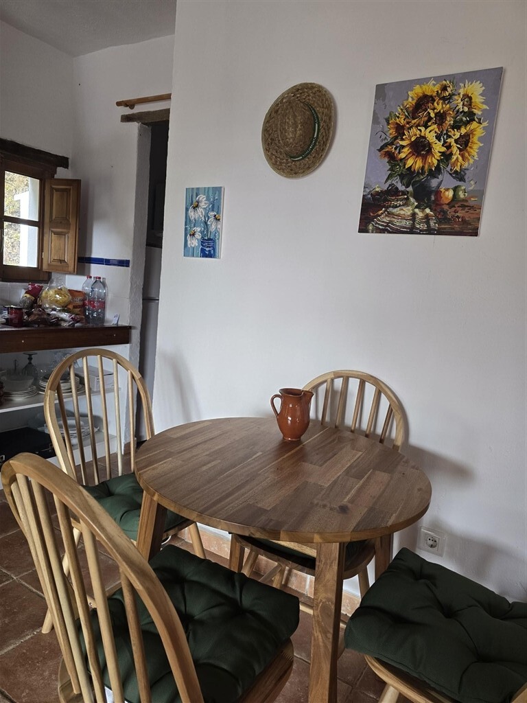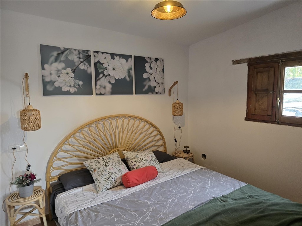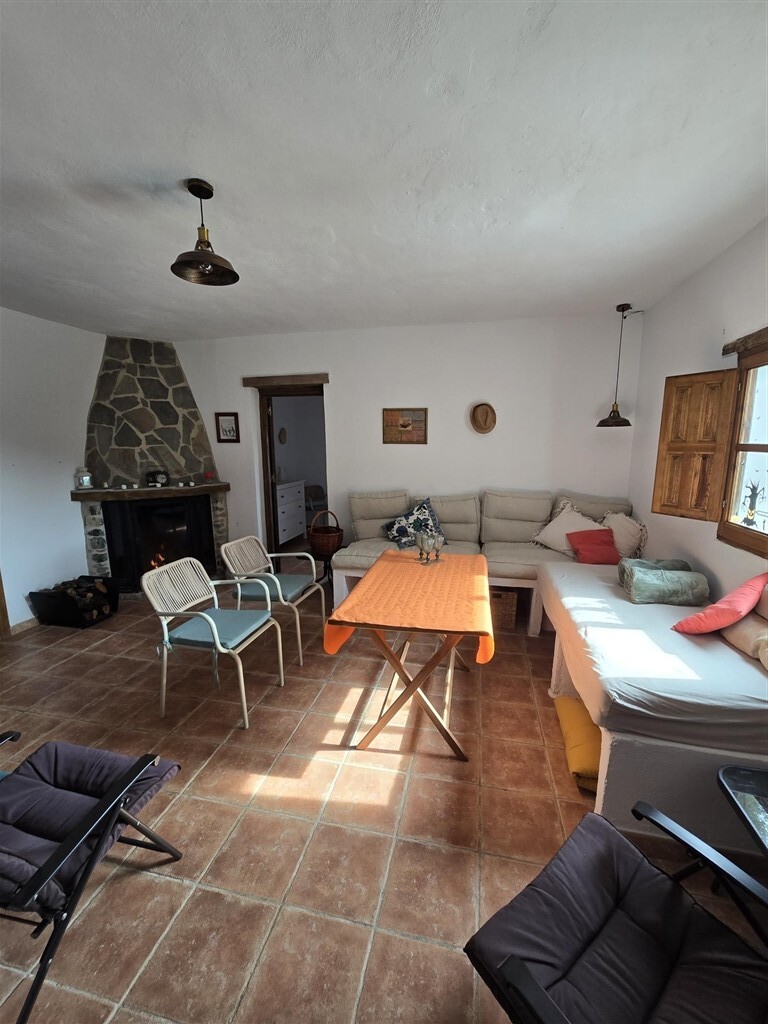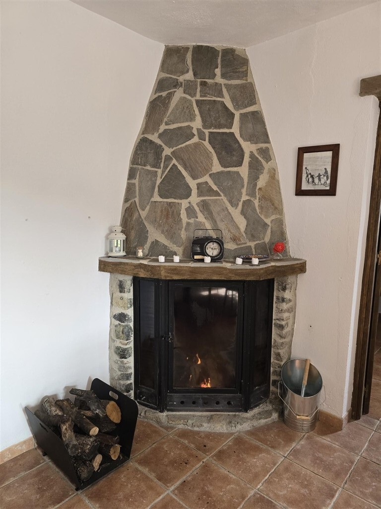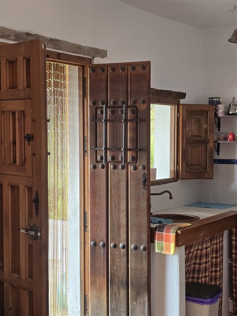 Casa de una planta de estilo rústico con techos de madera, ventanas de madera con postigos y suelos de terrazo. A casa tiene unos 100 m2 distribuidos en dos dormitorios de buen tamaño con armarios empotrados, salón con chimenea, baño, cocina-comedor, despensa, porche cubierto con pérgola de madera y suelos de piedra y trastero.