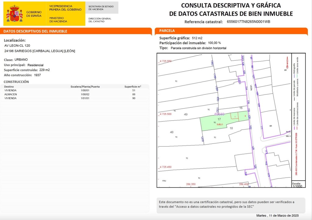 Imagina construir tu hogar en pleno corazón de Carbajal De La Legua (Sariegos, León), en un Solar Edificable de 512 m² ubicado en la Avda León. Esta Parcela Urbana cuenta con acceso para coche a la izquierda y entrada peatonal a la derecha, ideal para diseñar una Vivienda Unifamiliar cómoda y funcional con garaje y jardín.