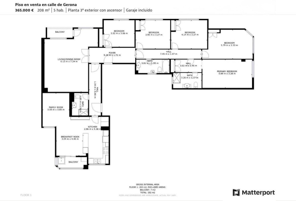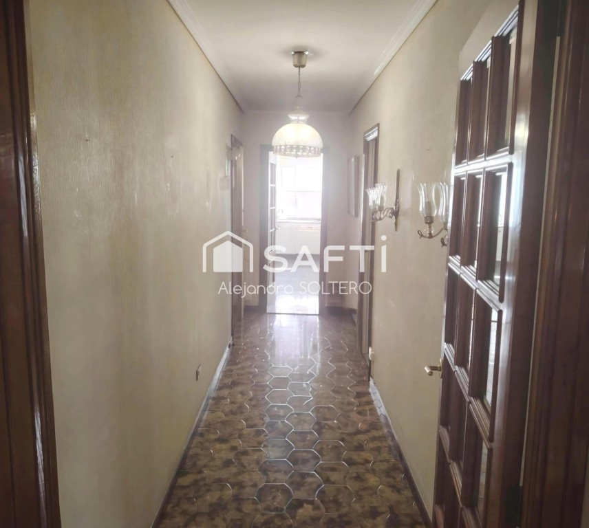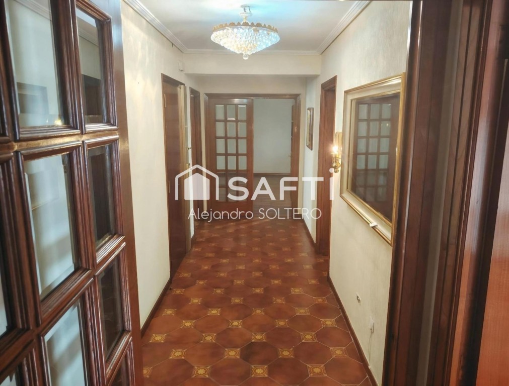 El piso cuenta con dos accesos independientes y una distribución práctica que combina elegancia y funcionalidad. Dispone de cinco dormitorios exteriores con armarios empotrados, dos de ellos especialmente amplios, incluyendo uno con baño en suite. El gran salón-comedor, muy luminoso, tiene salida a un balcón con vistas despejadas.