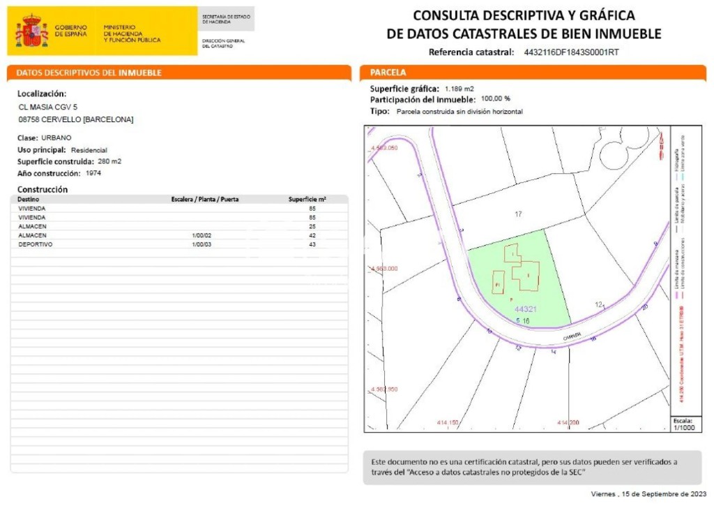 Acceso con portal automático. Cuenta con porche de acceso, fuente con estanque y jardines, terrazas en la parte posterior, local técnico para la piscina y un segundo porche en la zona inferior.